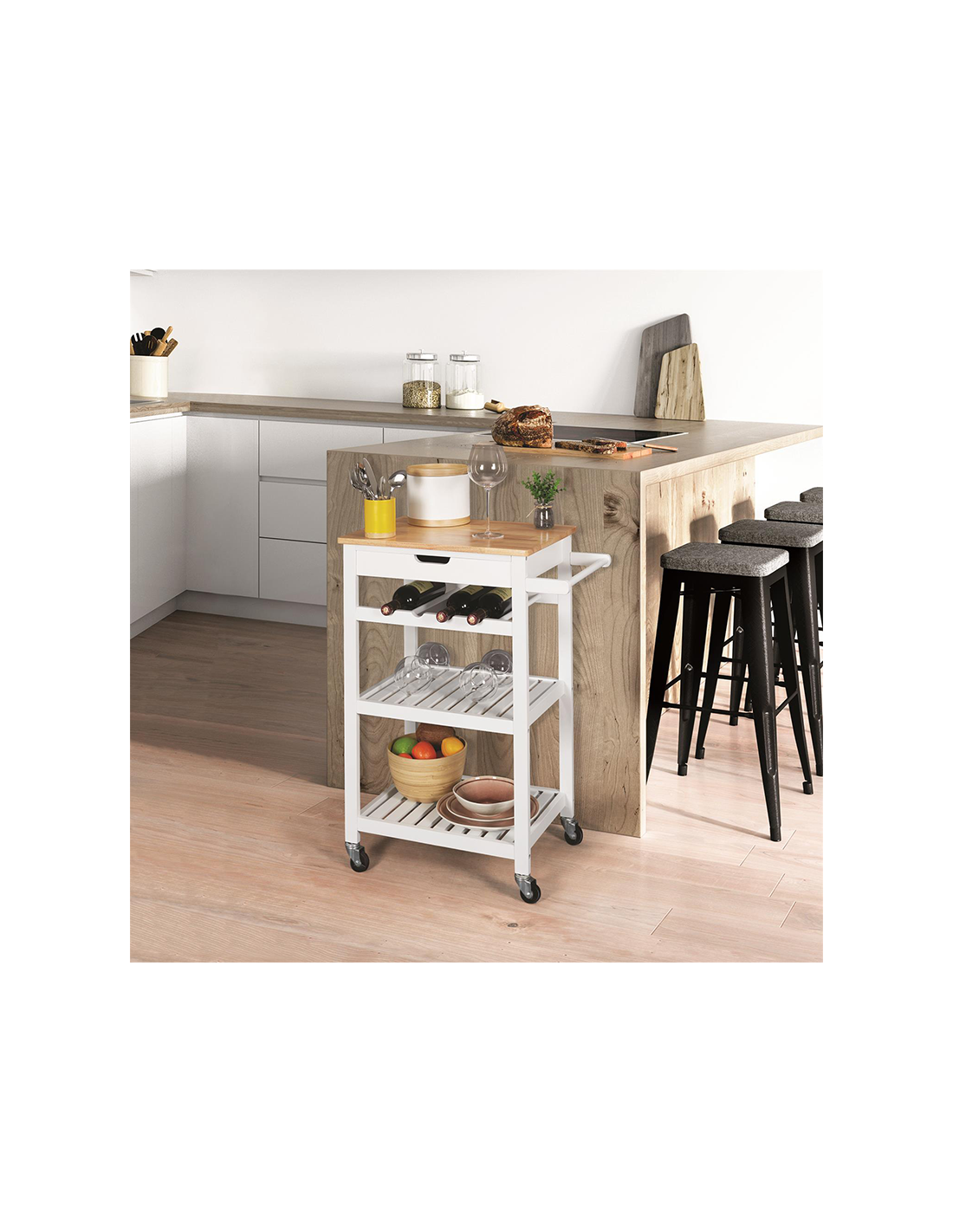 Le buffet mobile est doté de roulettes qui vous permettent de le déplacer dans la maison en fonction de vos besoins, ce qui améliore sa fonctionnalité et vous permet d'économiser de l'espace. Doté de deux étagères et d'un petit espace de rangement pour vos bouteilles de vin, ce magnifique meuble en bois d'hévéa blanc et MDF apportera une touche de style à n'importe quelle pièce de votre maison. La base roulante permet de le déplacer facilement dans la maison, de le nettoyer et de l'entretenir, laissant de la place pour d'autres meubles dans les coins le long du mur.
