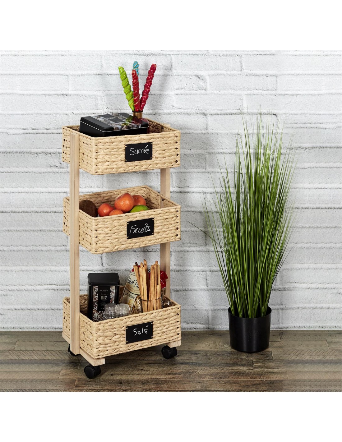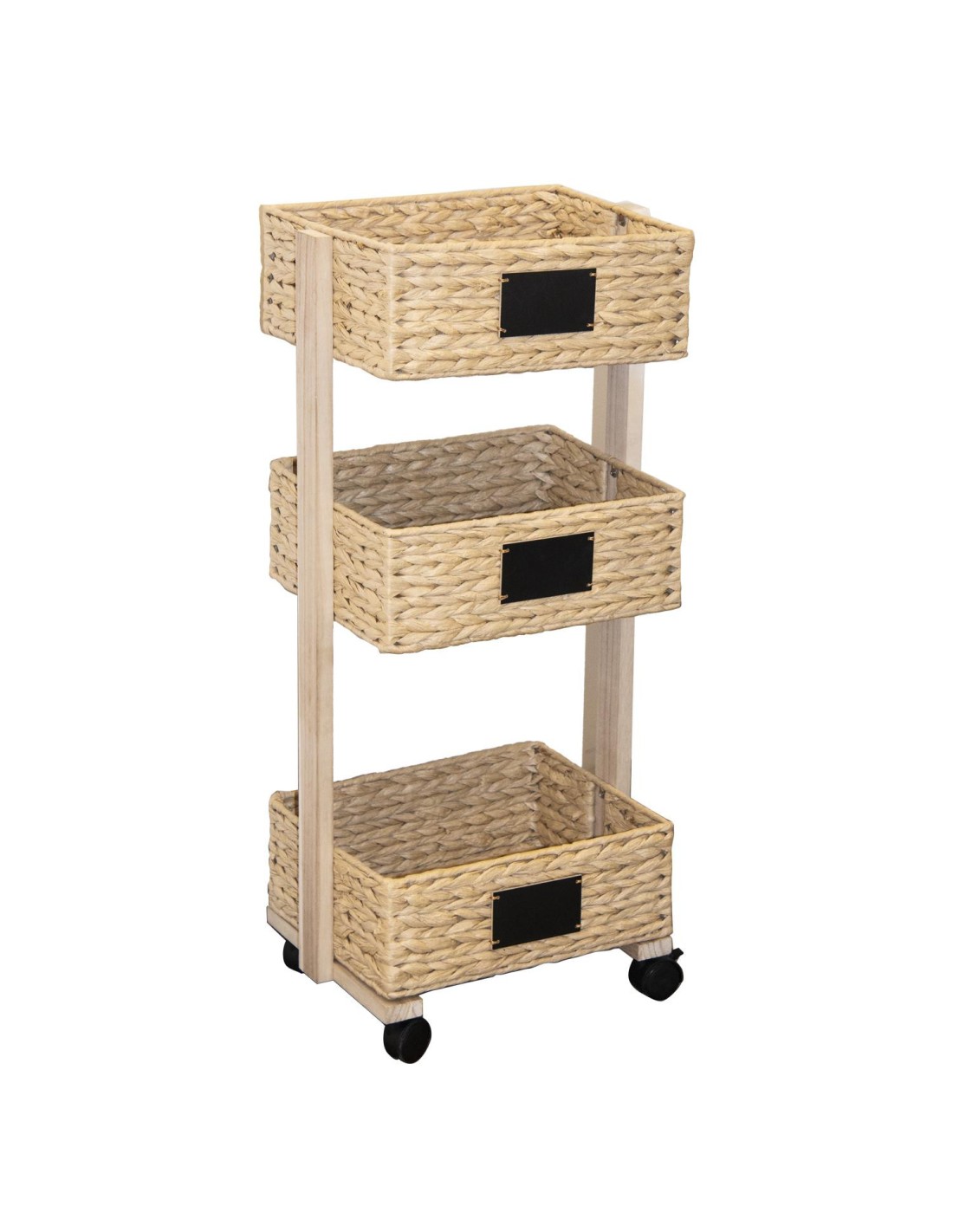 Vous ne manquerez plus d'espace de rangement avec cette desserte en bois à 4 roulettes. Esthétique et ultra-pratique à déplacer, elle s'intégrera parfaitement dans une cuisine, à côté d'un bureau ou encore dans une chambre à coucher sans perte de place. Profitez de 3 paniers de rangements tressés avec étiquette et organisez-votre quotidien comme bon vous semble !