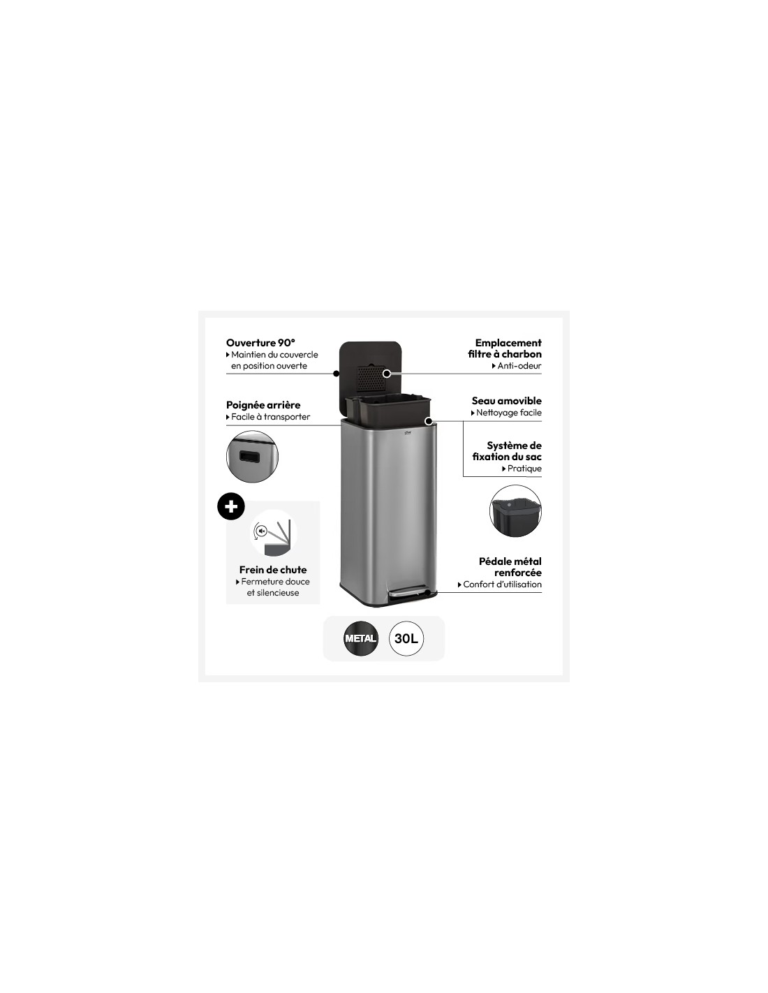 Optez pour l'élégance fonctionnelle avec la Poubelle à pédale carrée Delta 30L INOX de la marque Five, une fusion parfaite de design moderne et de praticité. Cette poubelle n'est pas seulement un accessoire, mais un véritable atout pour maintenir votre espace propre et ordonné tout en ajoutant une touche de style à votre décor. Avec ses 30 litres, elle est parfaitement dimensionnée pour les cuisines, les bureaux ou les espaces communs, minimisant la nécessité de vidage fréquent. Finie en acier inoxydable brillant, sa surface résiste aux empreintes digitales et aux taches, garantissant que l'élégance est maintenue même dans les environnements les plus fréquentés. Équipée d'une pédale robuste, elle permet une utilisation sans contact, idéale pour maintenir un environnement hygiénique sans avoir à toucher le couvercle. L'intérieur en plastique amovible simplifie le nettoyage et le changement de sacs, évitant les débordements et les résidus collants.