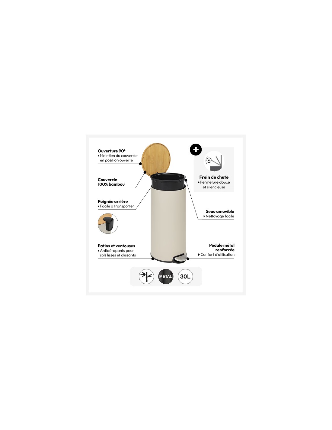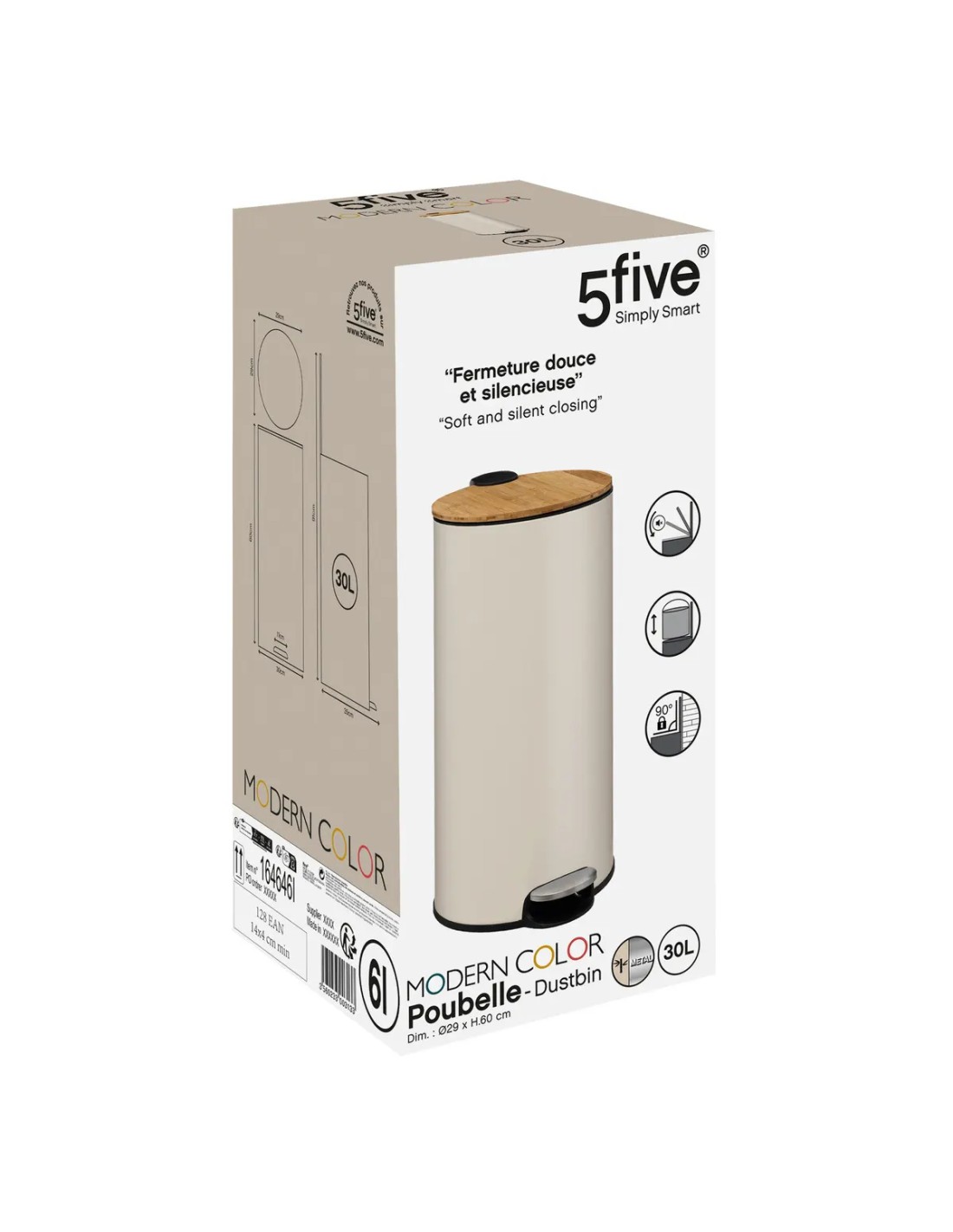 Transformez votre intérieur avec la poubelle en métal avec couvercle en bambou 30L beige de la marque Five. Alliant design raffiné et fonctionnalité optimale, elle est l’alliée parfaite pour une cuisine élégante, une salle de bain moderne ou un bureau épuré. Avec son coloris beige doux et apaisant, cette poubelle apporte une touche sobre et élégante à votre décoration. Son couvercle en bambou naturel ajoute une note chaleureuse et tendance, parfaite pour une ambiance moderne, scandinave ou minimaliste. Ouverture à pédale sans contact : une utilisation facile et hygiénique, sans avoir à toucher le couvercle. Conçue en métal robuste, cette poubelle garantit une longévité optimale et une résistance aux chocs et aux usages quotidiens. Son couvercle en bambou écologique limite la propagation des odeurs tout en apportant une touche naturelle et raffinée. Ajoutez une touche chic et fonctionnelle à votre intérieur avec la poubelle en métal avec couvercle en bambou 30L beige de Five.