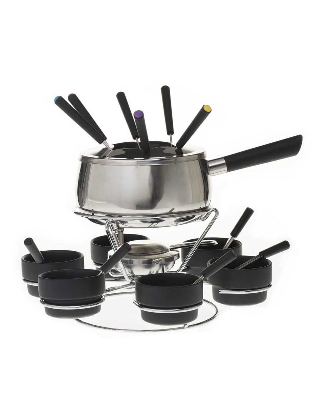Ce coffret de service à fondue sur plateau tournant contient 23 pièces. Contient : 1 caquelon à anses, 1 couvercle anti-éclaboussures avec découpe spécifique pour 6 fourchettes, 1 réchaud en inox s'emboîtant sous le caquelon, 1 brûleur à pâte à brûler ( non incluse), 6 fourchettes avec embouts de différentes couleurs, 6 cuillères, 6 ramequins ovales et 1 support pour bougie chauffe plat( bougie non incluse).