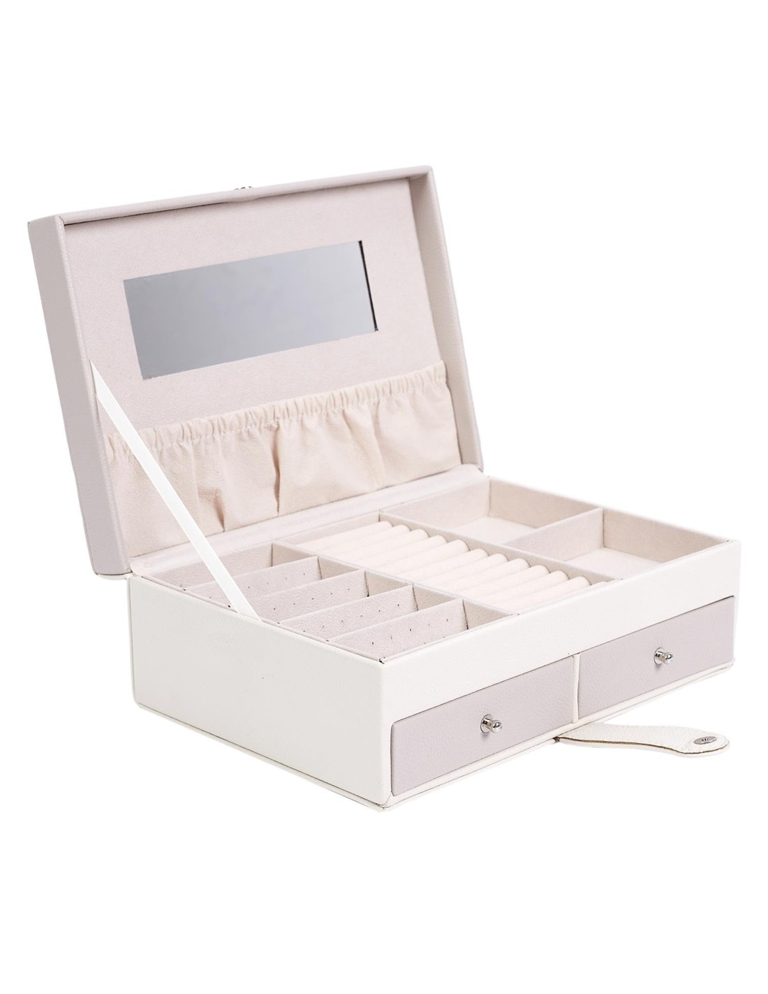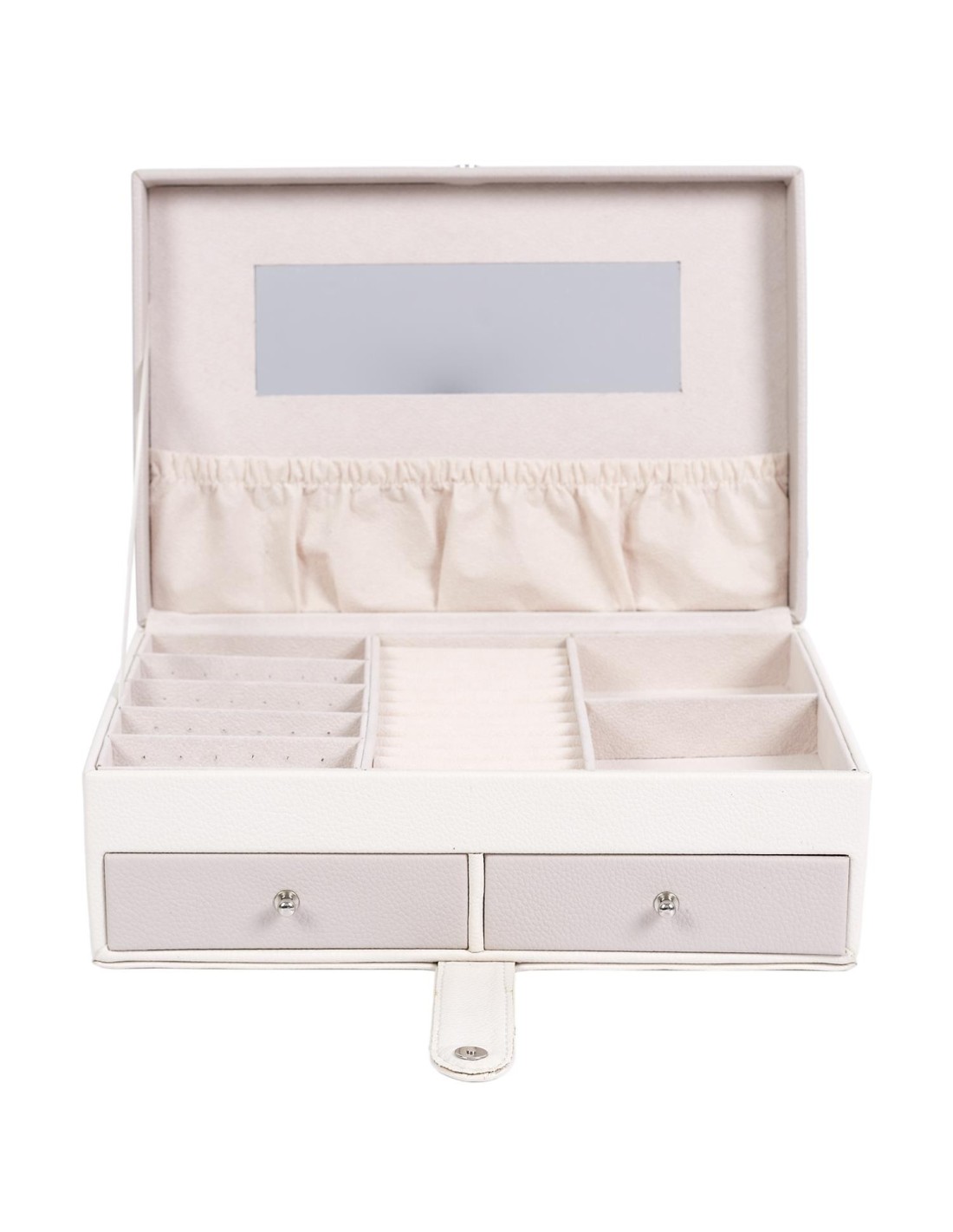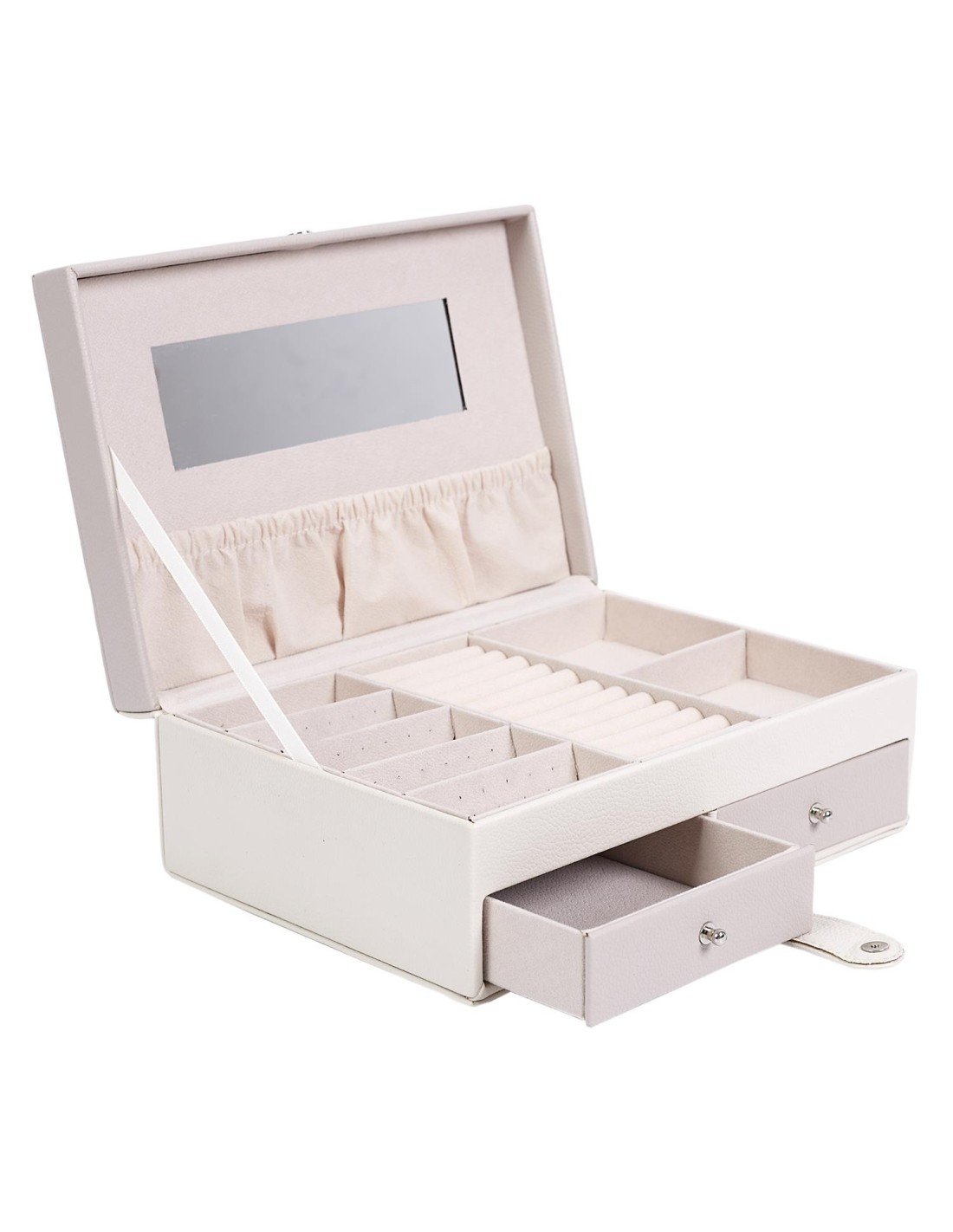 L'intérieur de la boîte est conçu pour maximiser l'organisation de vos bijoux. Elle comporte plusieurs compartiments, tiroirs et crochets pour pendre des colliers, permettant ainsi de séparer et de protéger vos bijoux de manière ordonnée. La boîte est équipée d'un miroir intégré pratique. Cela facilite l'essai de vos bijoux et vous permet de vous assurer que chaque pièce complète parfaitement votre tenue.