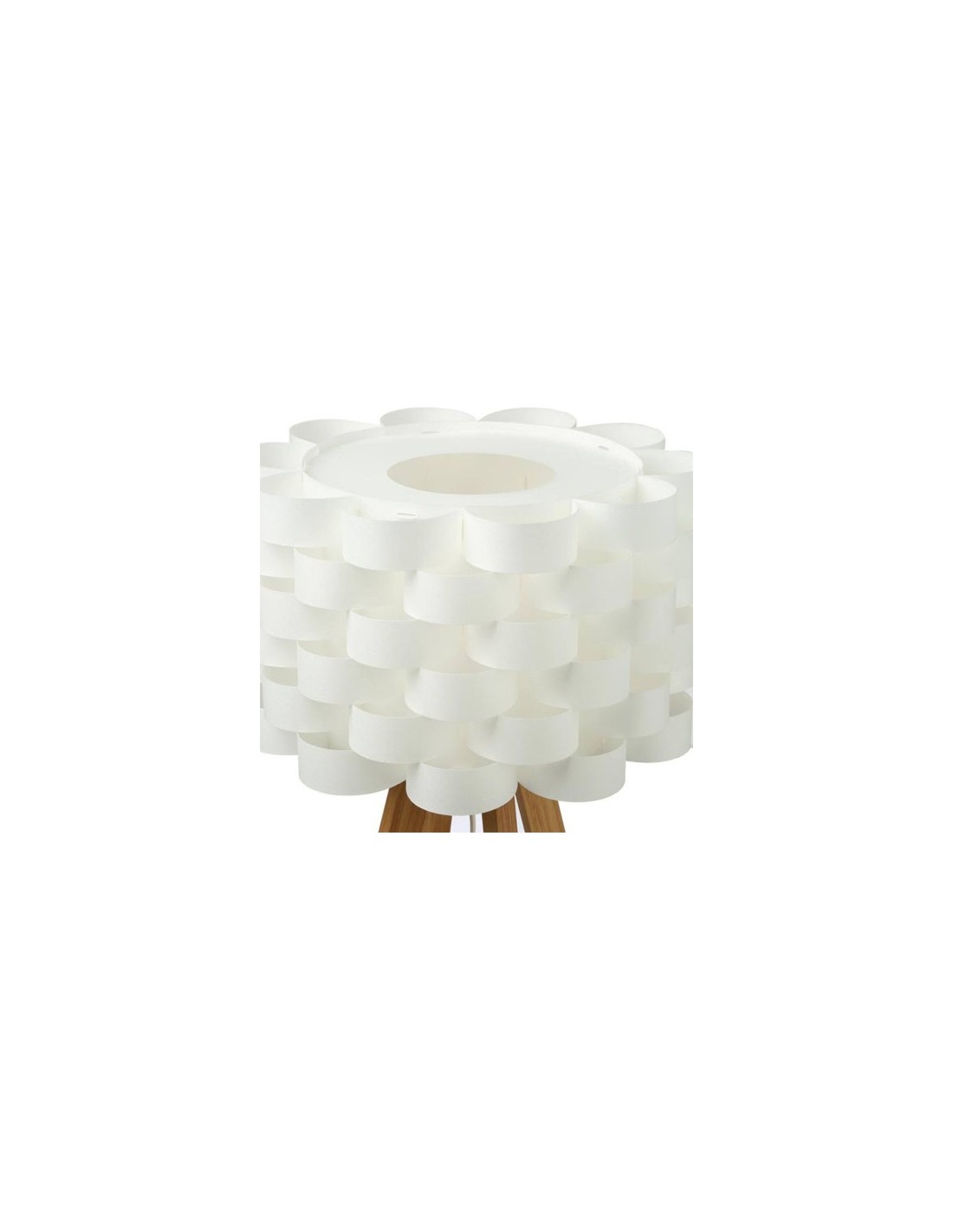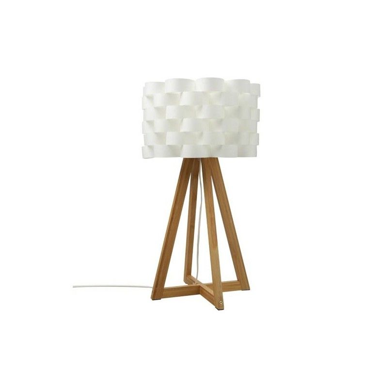 Cette lampe à poser est dotée d'un pied en bambou et d'un abat-jour en aspect fibre de verre constitué de lamelles.