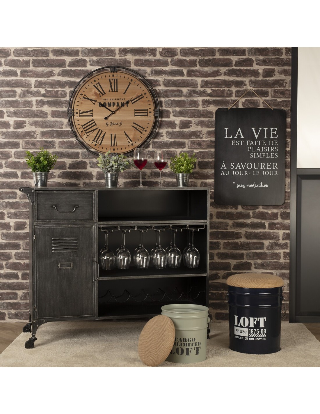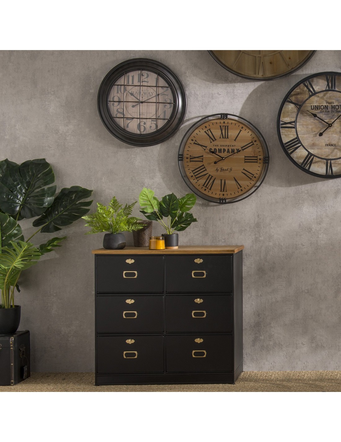 Cette pendule est composée d'un cadran en fer, d'une structure en bois MDF et d'une partie électrique en plastique ABS. Elle possède un mécanisme sans tic tac.
