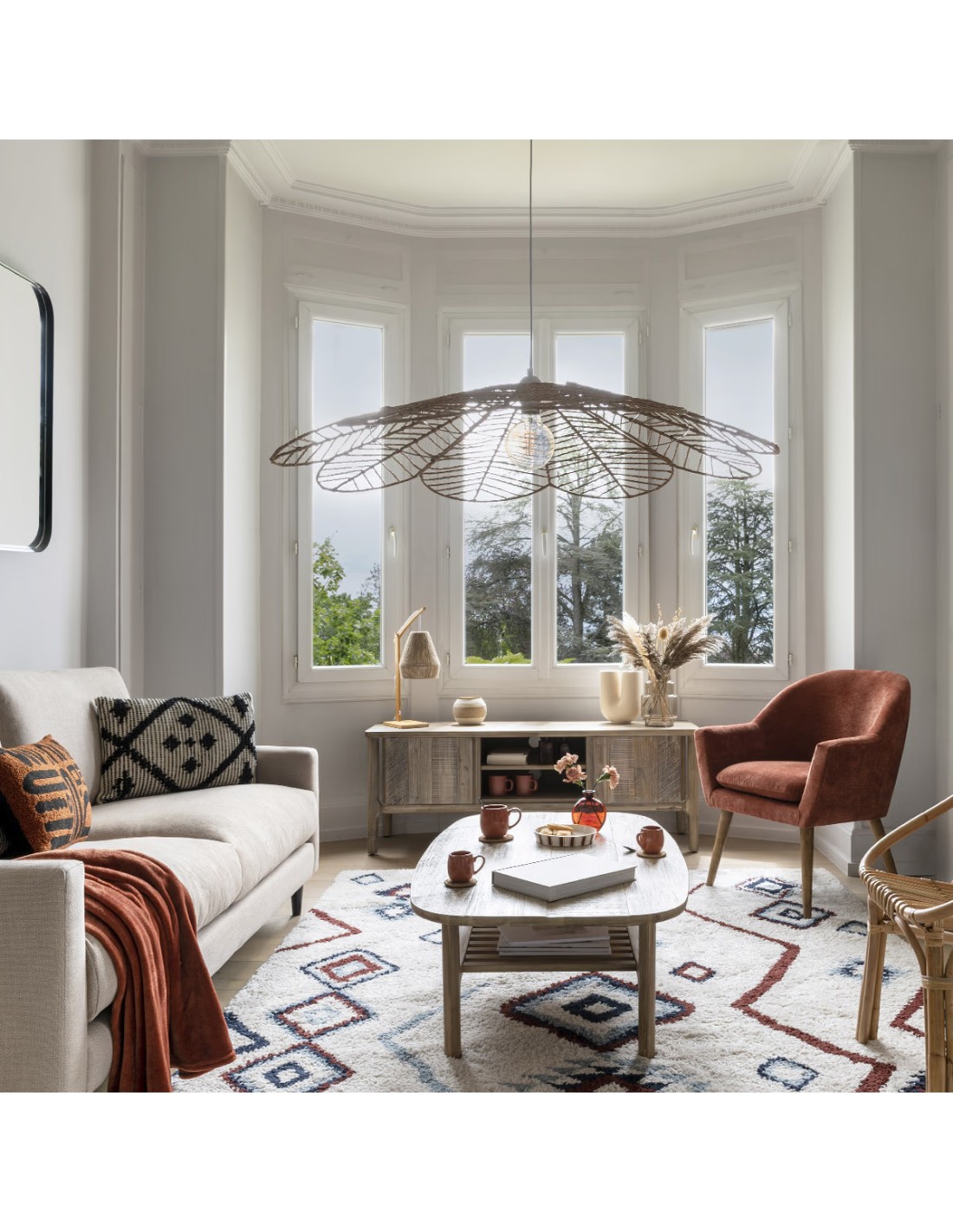 Transformez votre intérieur en un véritable havre de paix avec la Suspension Corde Folk Natural D98 de la marque Atmosphera. Son design majestueux et son tressage en corde naturelle font de ce luminaire une pièce unique, parfaite pour créer une ambiance chaleureuse et authentique dans votre salon, salle à manger ou chambre. Avec son diamètre impressionnant de 98 cm, cette suspension devient une véritable pièce maîtresse qui attire le regard et sublime votre décoration. Son tressage en corde naturelle lui confère un charme artisanal et une ambiance cosy, idéale pour une décoration bohème, ethnique ou bord de mer. Sa conception ajourée permet une diffusion subtile de la lumière, créant des jeux d’ombres élégants pour une atmosphère apaisante et cocooning. La Suspension Corde Folk Natural D98 est bien plus qu’un luminaire, c’est un véritable élément décoratif qui apporte du cachet et une atmosphère douce et chaleureuse à votre intérieur. Faites entrer la nature chez vous et illuminez vos espaces avec élégance et authenticité !