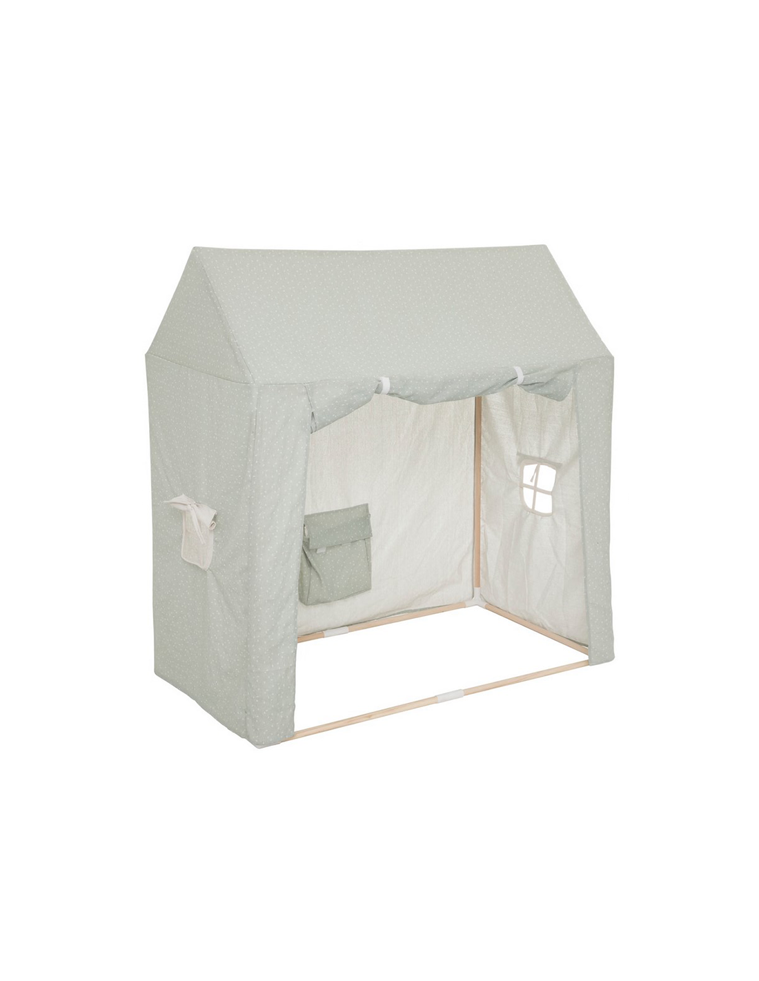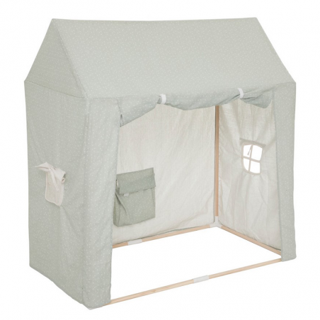 Votre petit enfant a toujours besoin une place pour qu’il puisse y jouer et s’y cacher. Finalement, nous vous proposons notre cabane campagne et elle accueillera votre enfant, ses doudous et ses jeux. Elle est dotée d’une petite fenêtre et de plusieurs poches de rangement en tissu. Une longueur peut s’enrouler entièrement et se maintenir ouverte grâce à des liens. La toile est lavable en machine.