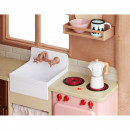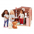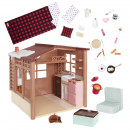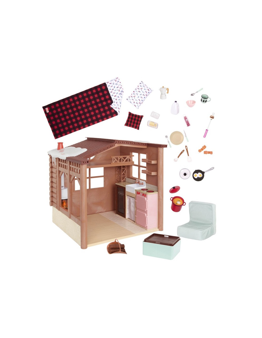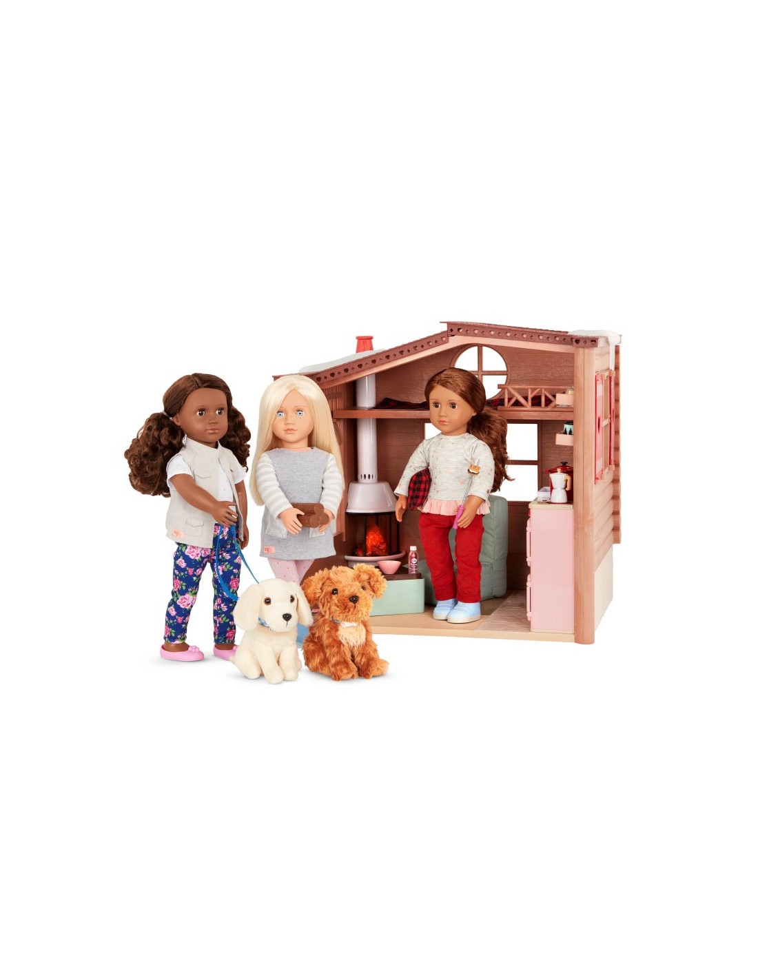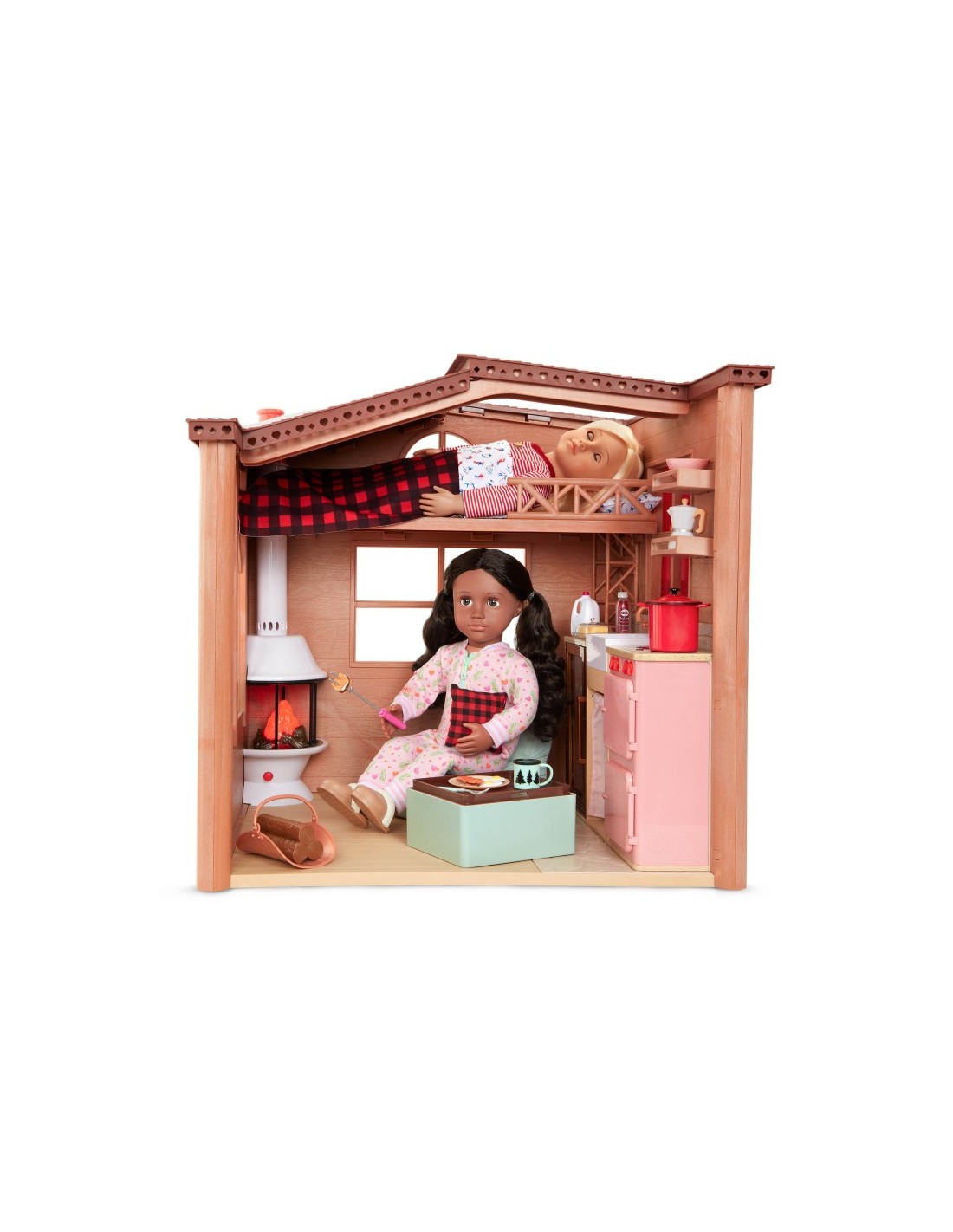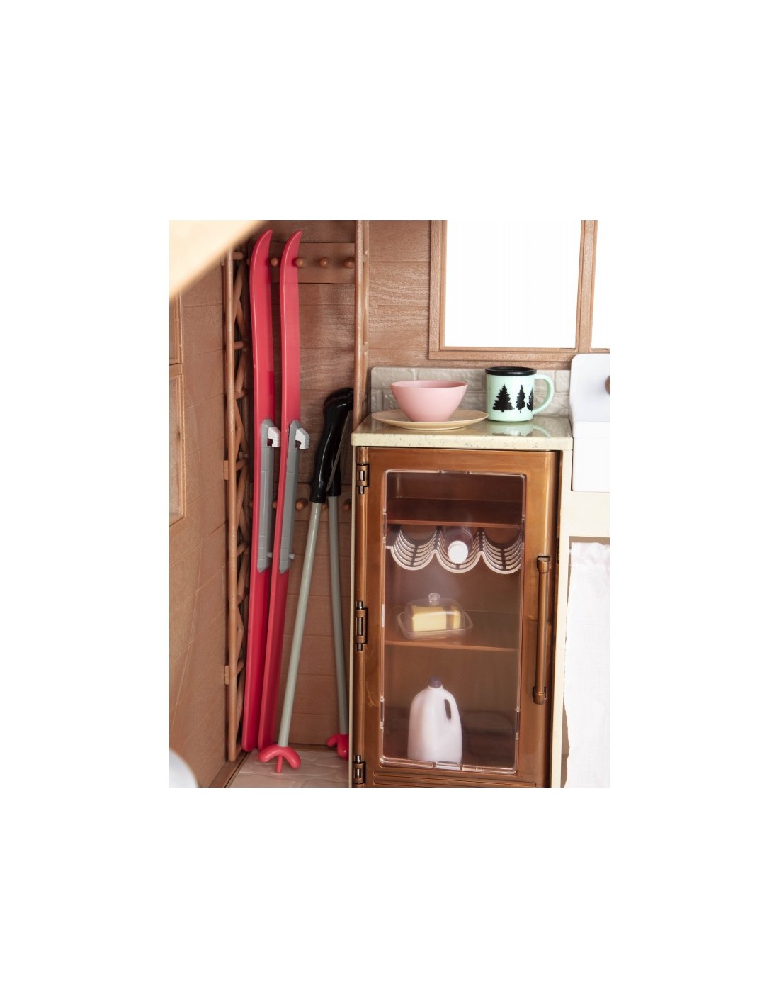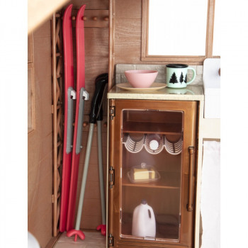 Un chalet de ski pour poupées de 46 cm Our Génération. Il comprend différents accessoires: cafetière, bol, œufs au plat, bouteille de jus, bouteille de lait…. La cuisinière s'allume lorsque vous tournez les boutons et la cheminée est sonore et lumineuse !