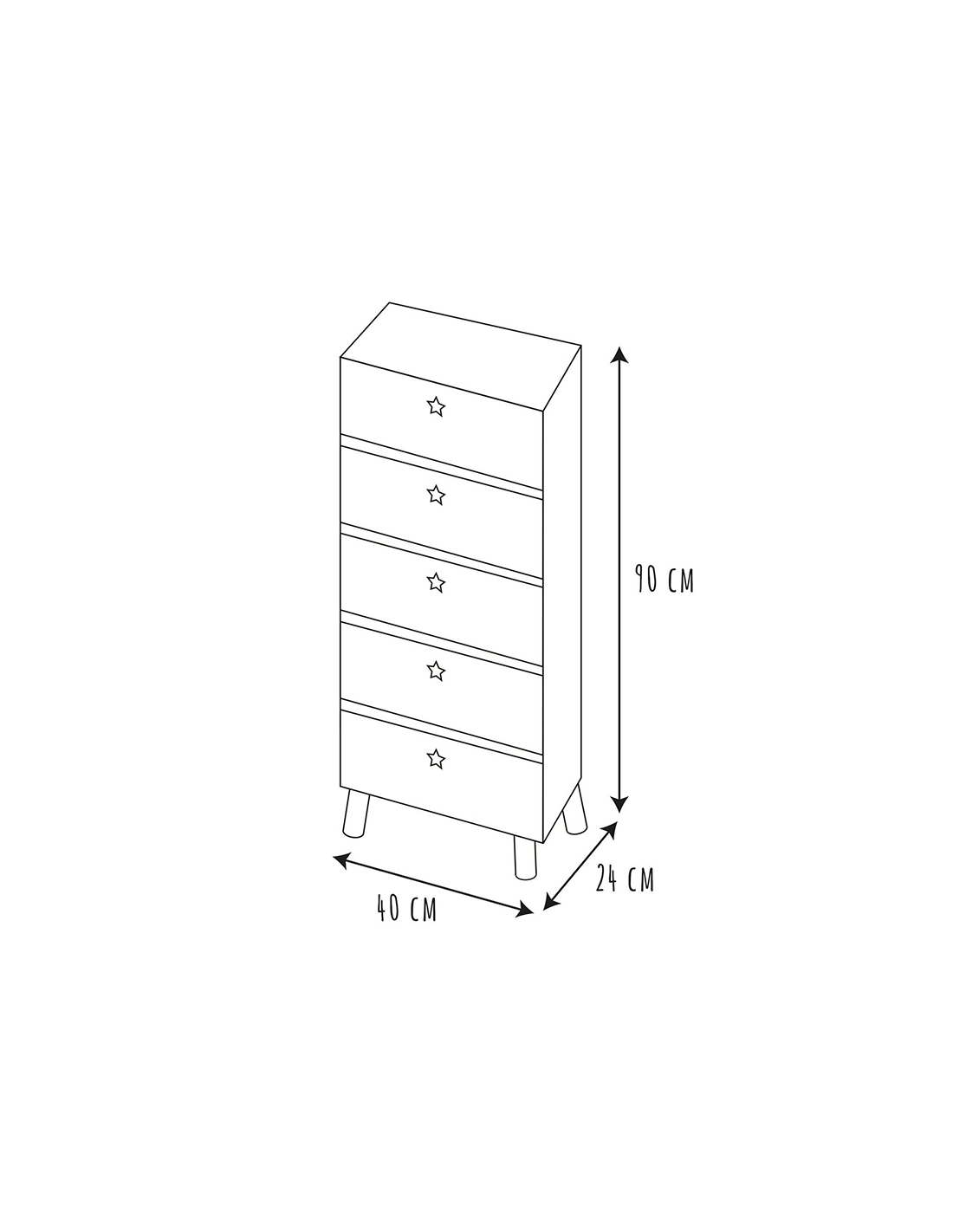 Ajoutez une nouvelle dimension à la chambre de votre enfant avec cette chiffonnière. Elle est dotée de cinq tiroirs spacieux, ce qui vous permet de ranger les jouets et les vêtements de manière ordonnée dans le placard ou facilement accessible au bout du lit.