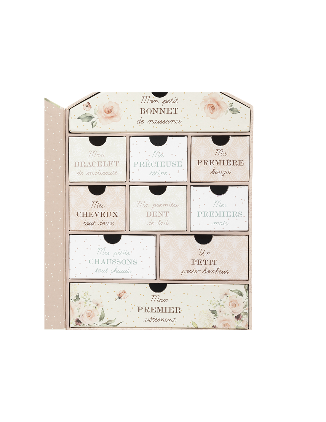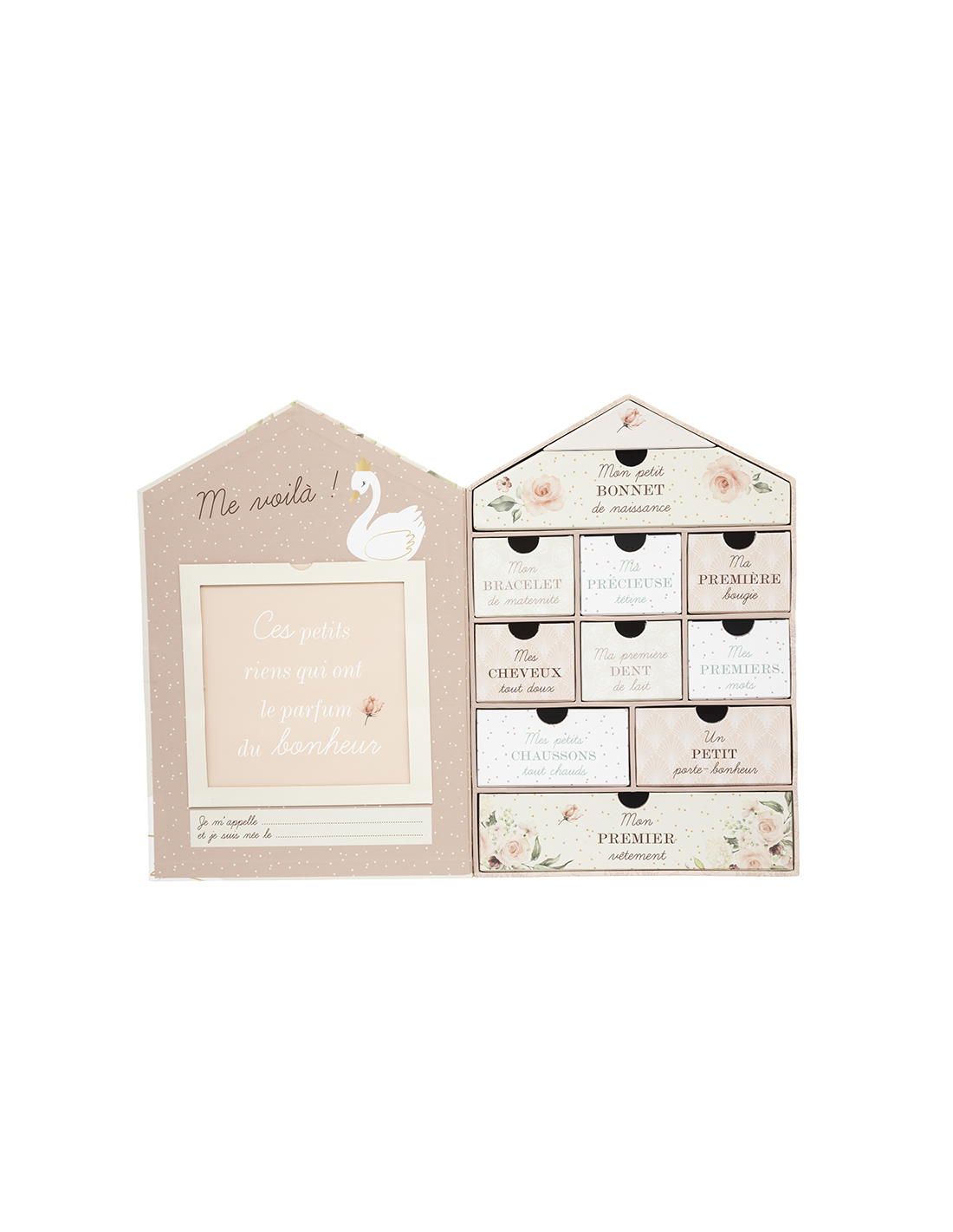 Ce joli coffret de naissance est un cadeau très mignon. En forme de maison et avec 10 tiroirs il peut vous servir pour y ranger tous les premiers souvenirs de bébé. Il est présenté sur le thème des animaux de la foret !