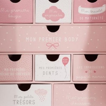 Une jolie boîte avec 9 compartiments pour garder les affaires plus importantes dès la naissance de votre bébé. Cette boîte convient à une fille et vous pouvez conserver tel un trésor tous les souvenirs de bébé : le premier bracelet de naissance, la première tétine, la première mèche de cheveux, le premier vêtement, la première dent de lait, , les premiers chaussons, les premiers mots, les premiers trésors...