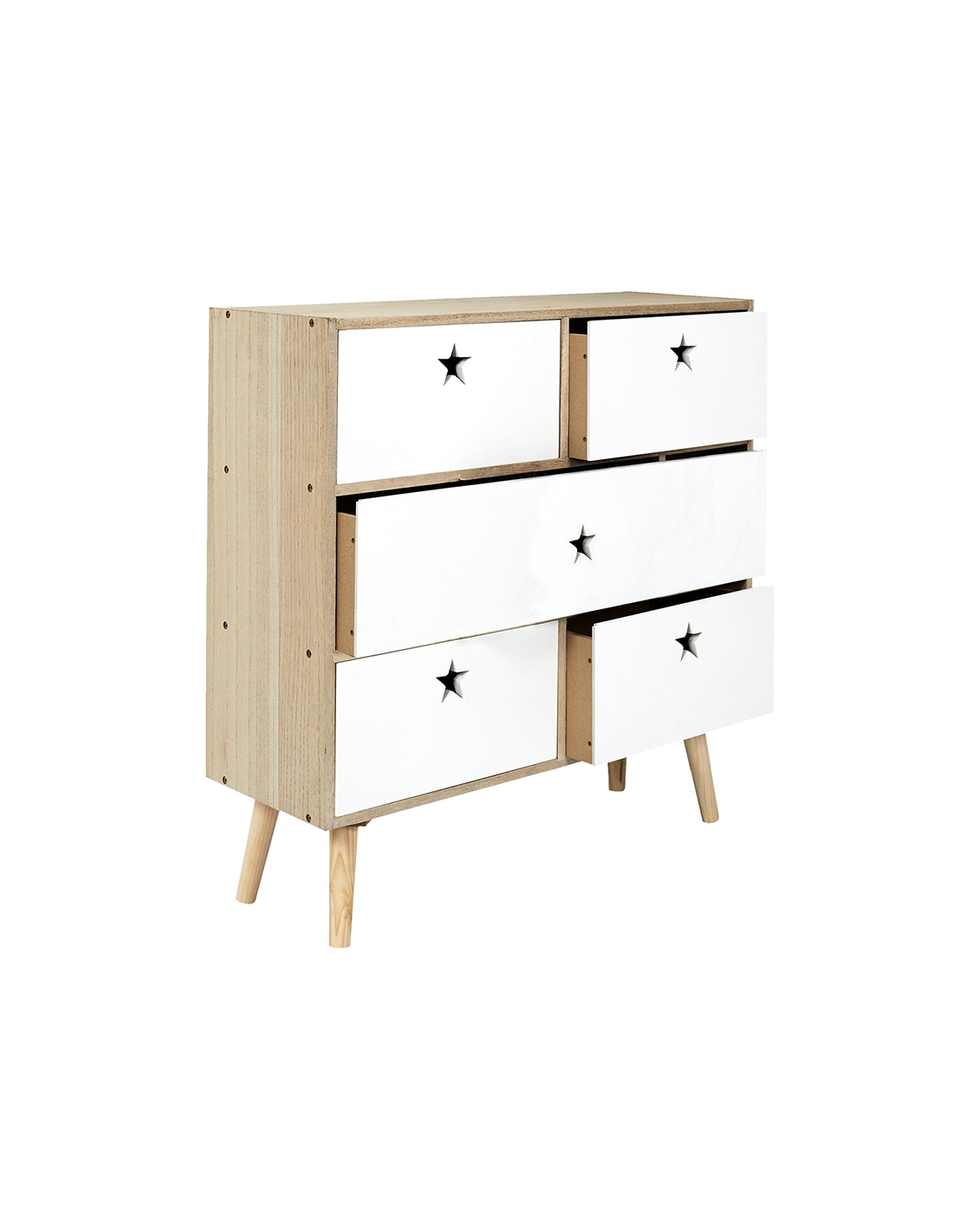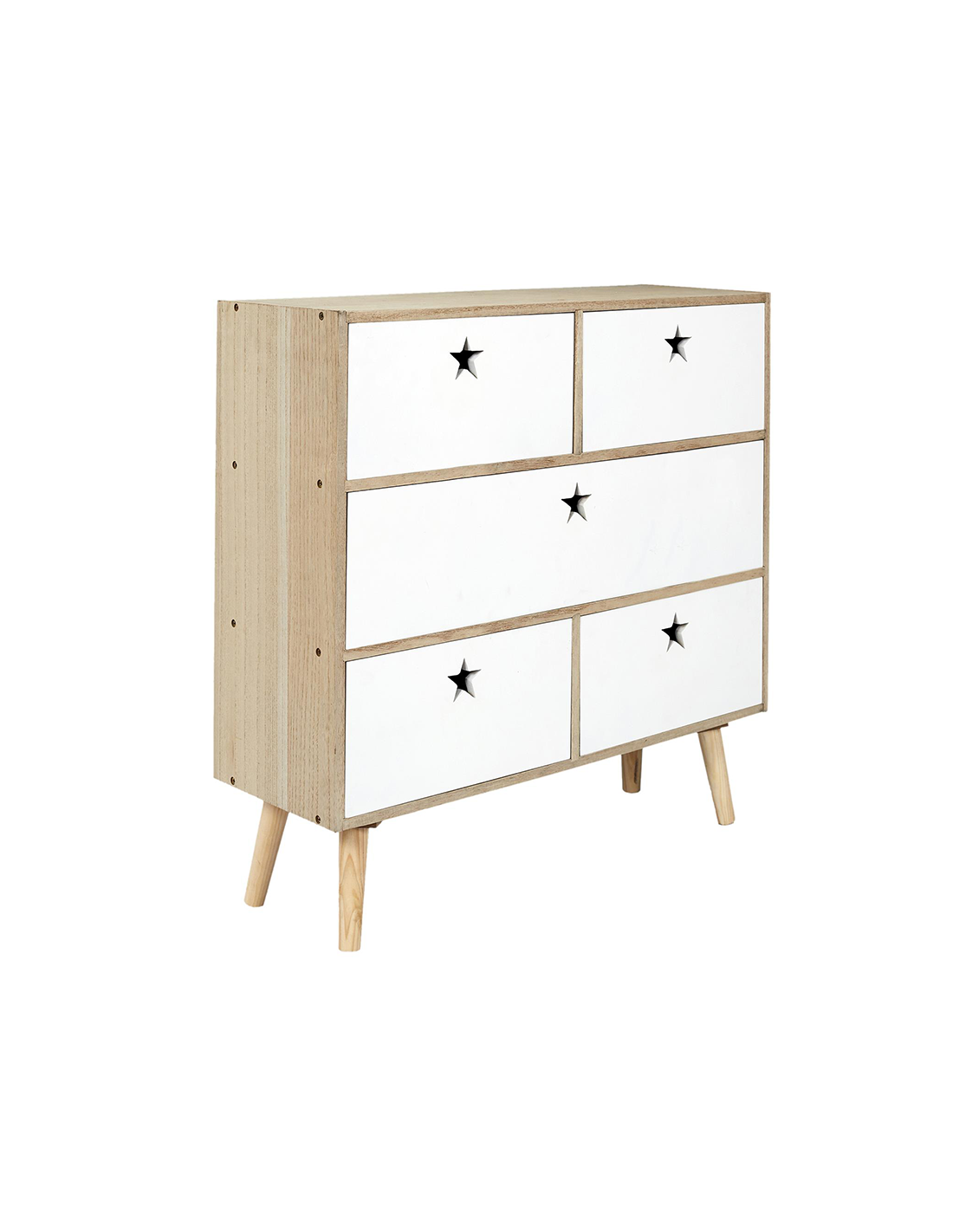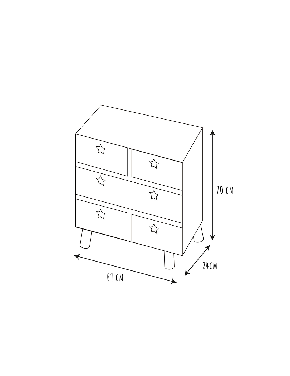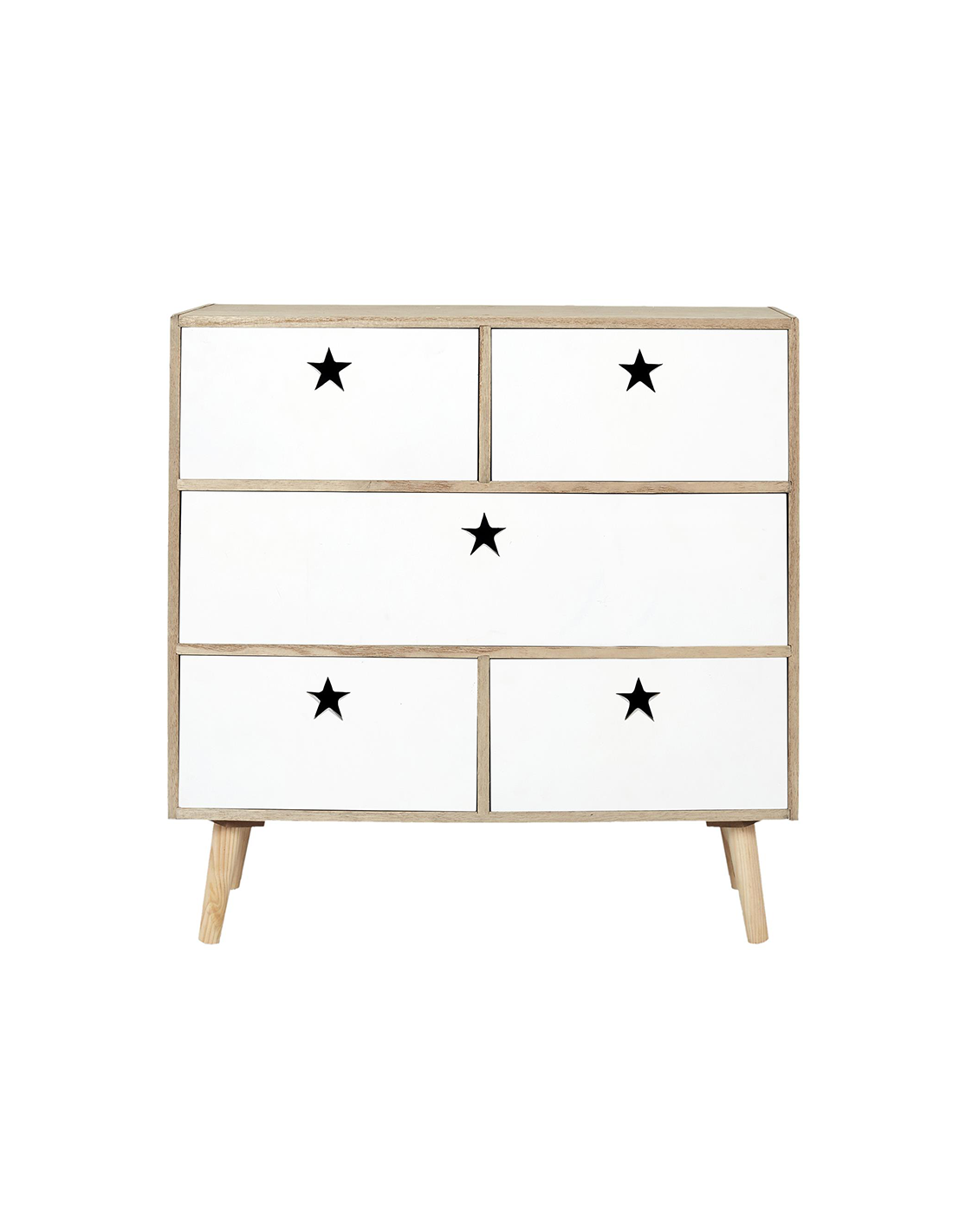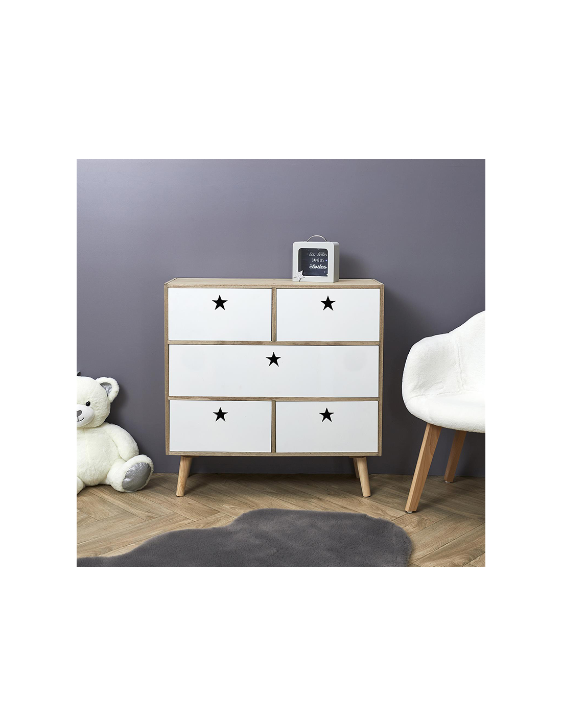 Cette commode pour enfants est un modèle avec des poignées en forme d'étoile. La couleur blanche du meuble en fait un choix parfait pour les chambres d'enfants et les crèches. Ses cinq tiroirs offrent beaucoup d'espace pour organiser les vêtements et les jouets de votre enfant, tout en apportant une touche moderne au décor de sa chambre. La commode a été conçue avec une couleur blanche pour ajouter un élément de fraîcheur à la pièce. Imitation d'une étoile dans la forme de la poignée et de la face avant.