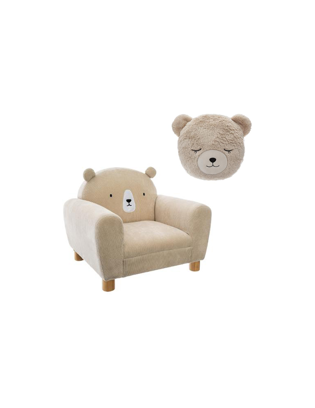 Ce pack complétera la décoration de la chambre de votre enfant. Il contient : un fauteuil enfant ours beige et un coussin ours beige. Dimensions de fauteuil : L52 x P44 x H43 cm Dimensions de coussin : L27 x l27 cm Couleur : Beige Composez une décoration sur le thème animal dans la chambre de votre enfant.