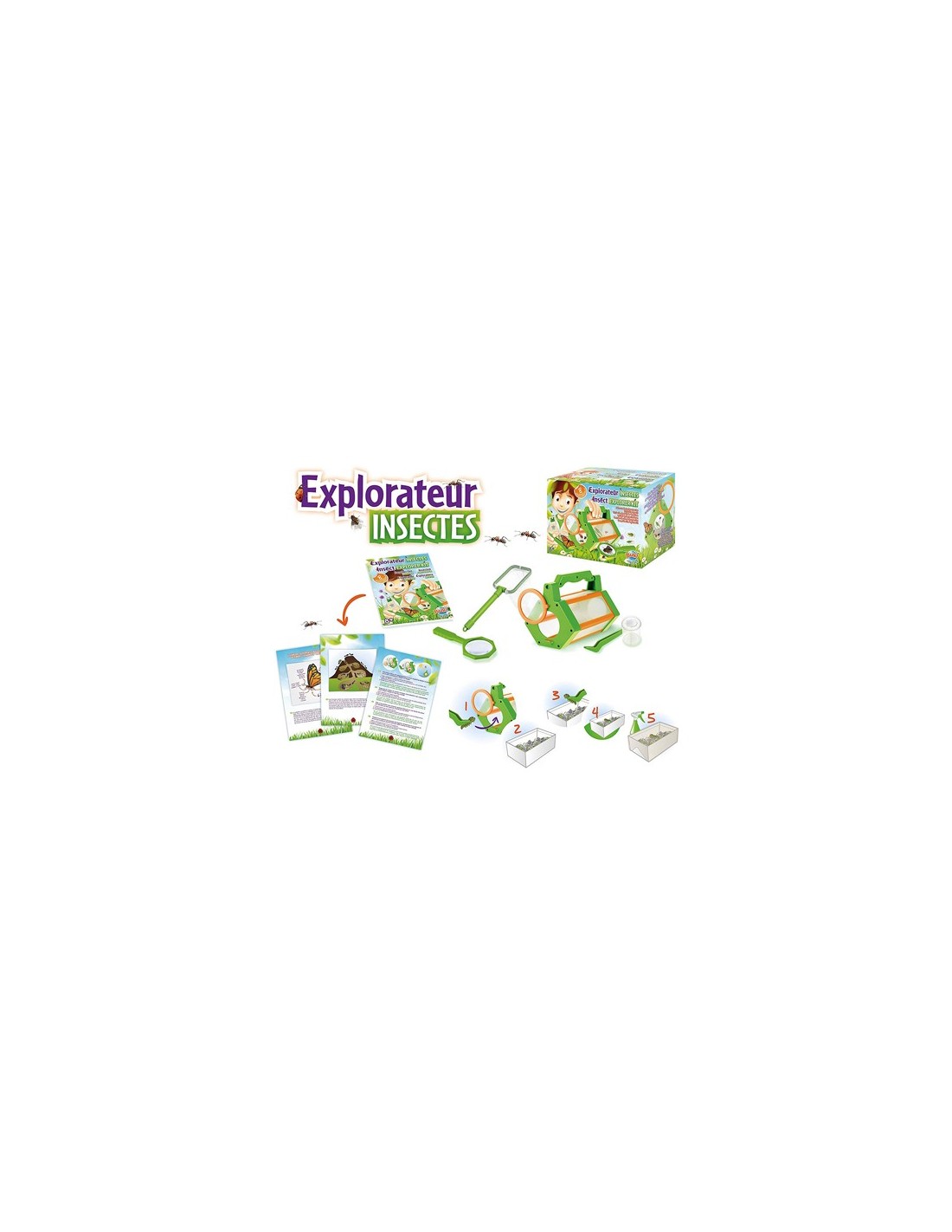 Retrouve un assortiment d'accessoires pour attraper et observer les insectes: loupe, filet, habitat, pince...