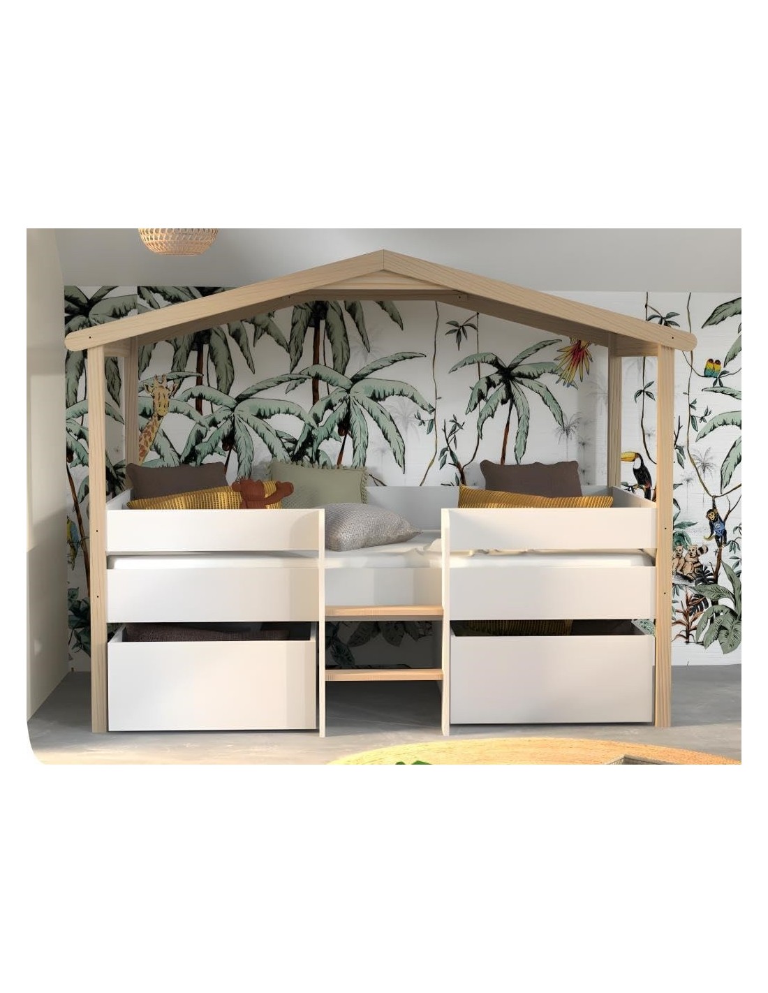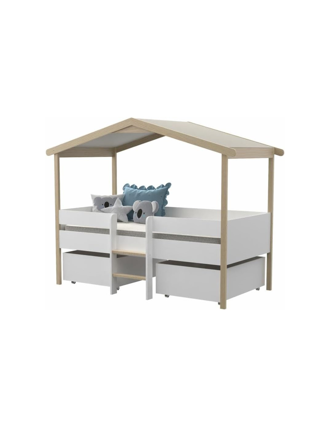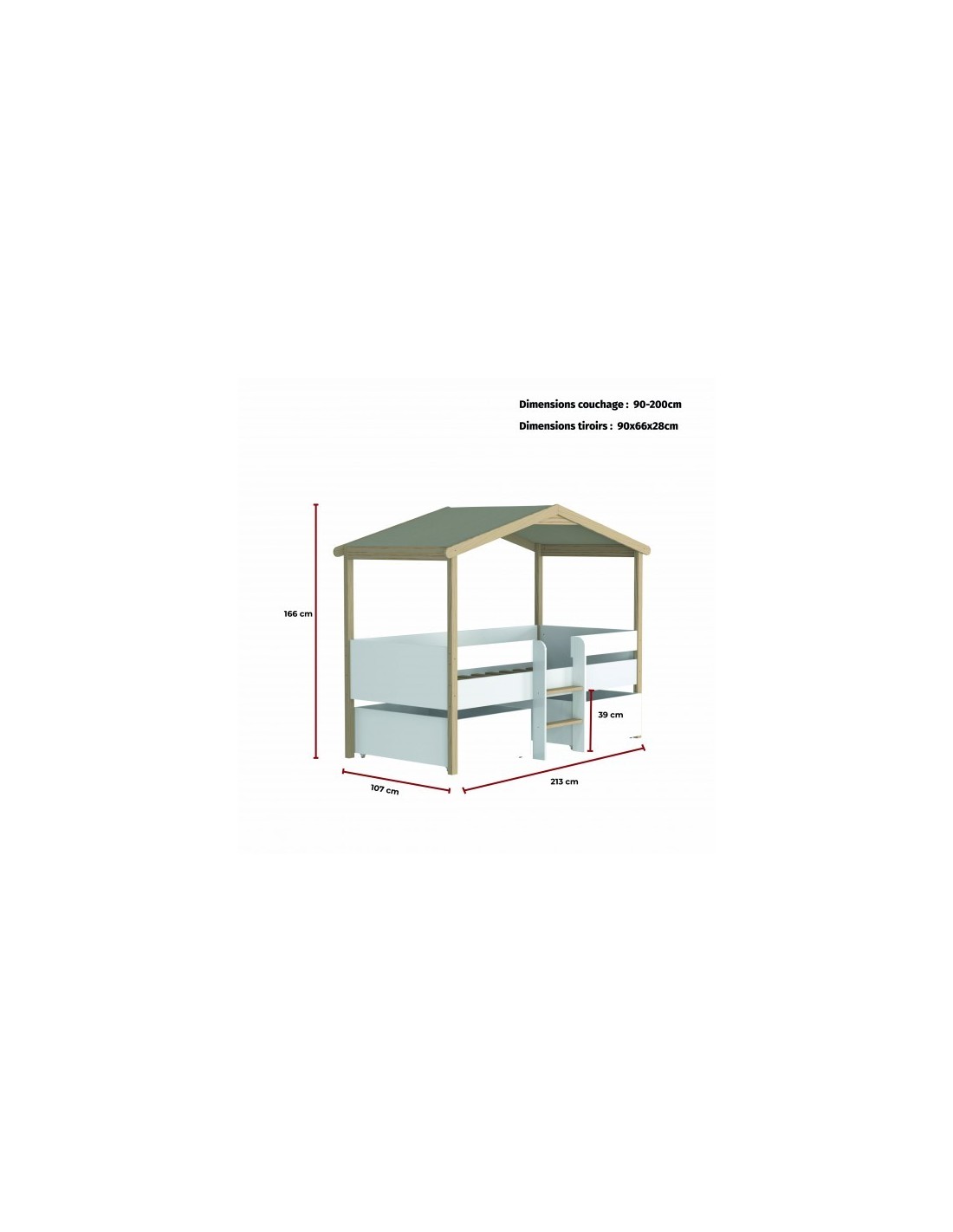 Caractéristiques sur le Lit cabane enfant PILOTI 90x190 avec sommier + 2 tiroirs Naturel - Weber Industries :