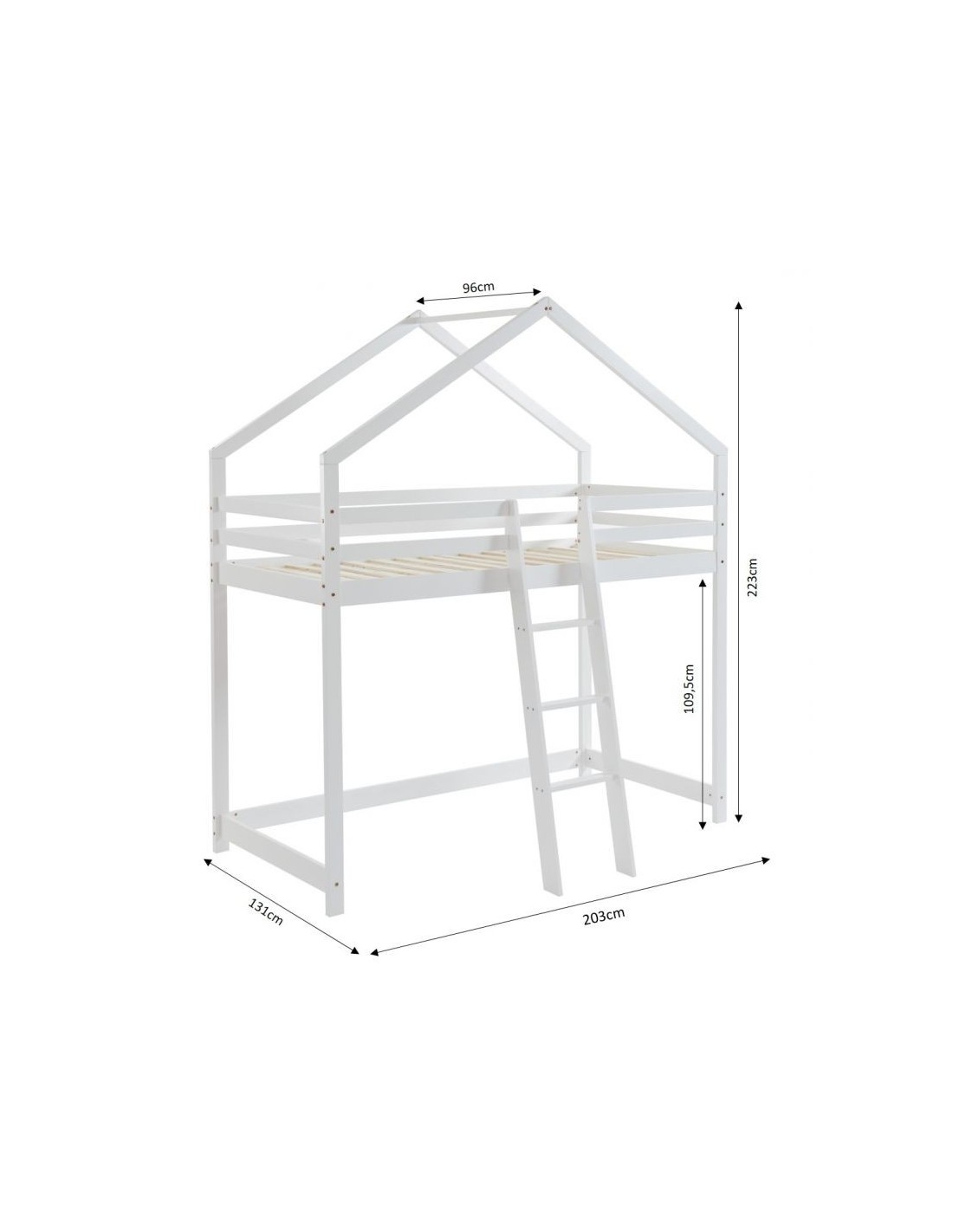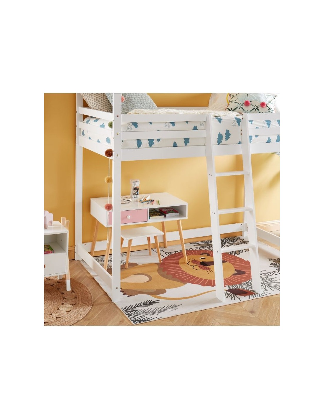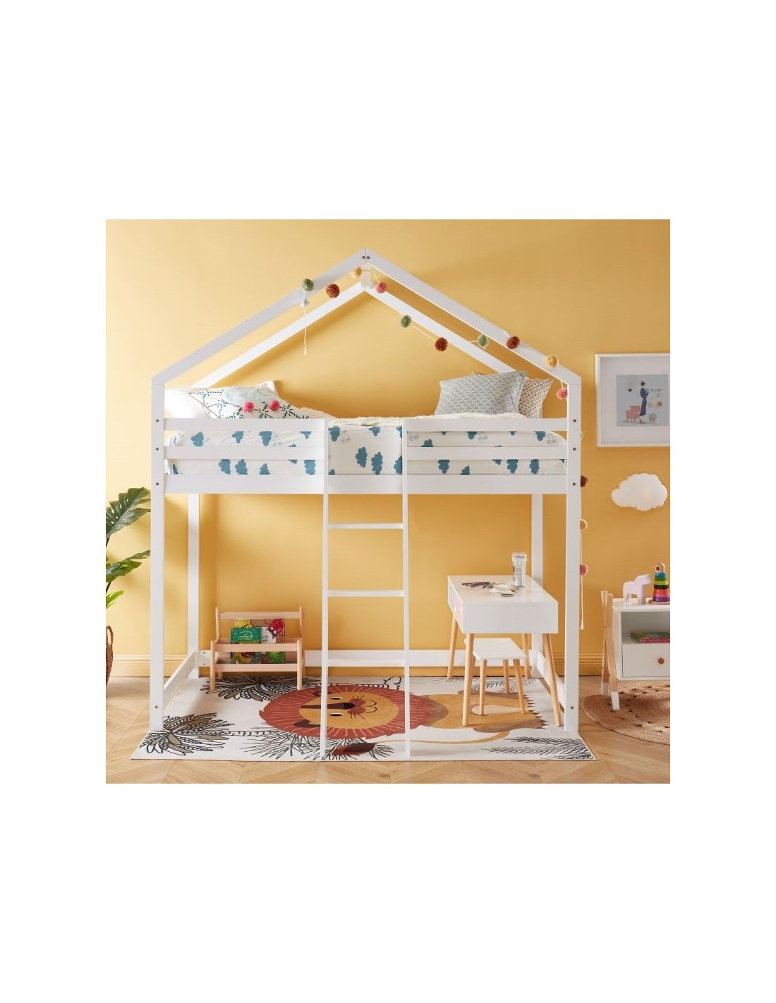 Et ce n'est pas tout : la sécurité de votre enfant est notre priorité. Ce lit cabane mezzanine est doté de barrières de sécurité robustes qui protègent votre enfant pendant son sommeil. De plus, l'échelle solide et sécurisée facilite l'accès au lit et ajoute une touche d'aventure à l'heure du coucher.