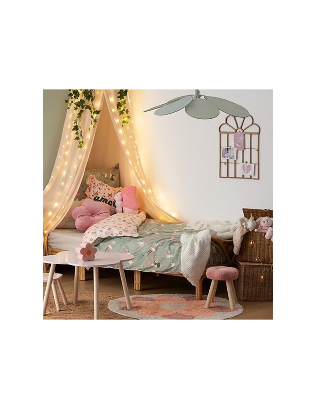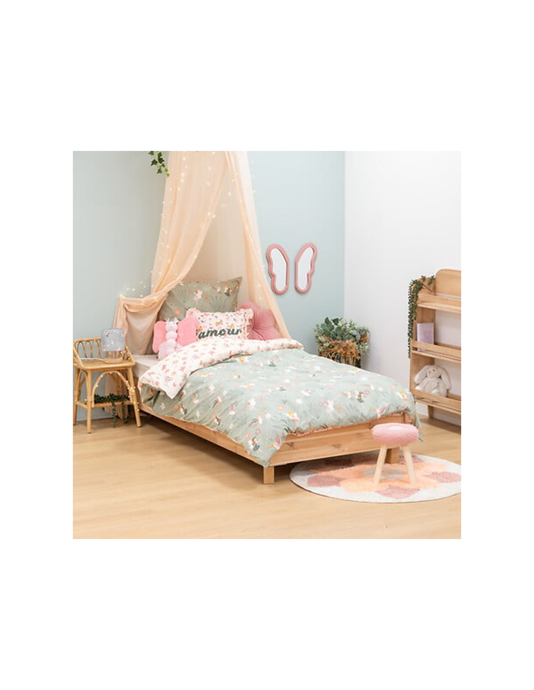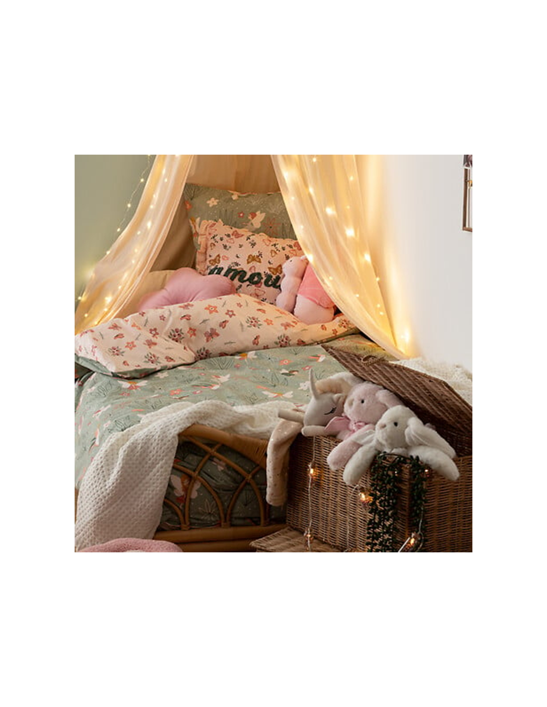 Offrez à votre enfant un sommeil doux et féerique grâce à cette magnifique parure de lit conçue pour stimuler l'imagination et ajouter une touche de magie à sa chambre. Idéale pour un lit simple, cette parure est à la fois fonctionnelle et décorative. Un imprimé délicat de fées et d’éléments naturels, dans des tons apaisants de vert et beige, qui invite à la rêverie. Fabriquée en coton de qualité, elle garantit une sensation agréable sur la peau et un confort optimal pour des nuits paisibles. 140x200 cm, adaptée aux lits simples, avec une taie d'oreiller assortie (63x63 cm) pour une harmonie parfaite. Le motif de fées transporte votre enfant dans un univers de contes de fées, parfait pour favoriser des rêves merveilleux. Que ce soit pour un anniversaire ou juste pour faire plaisir, cette parure de lit saura ravir les petits amateurs de magie.