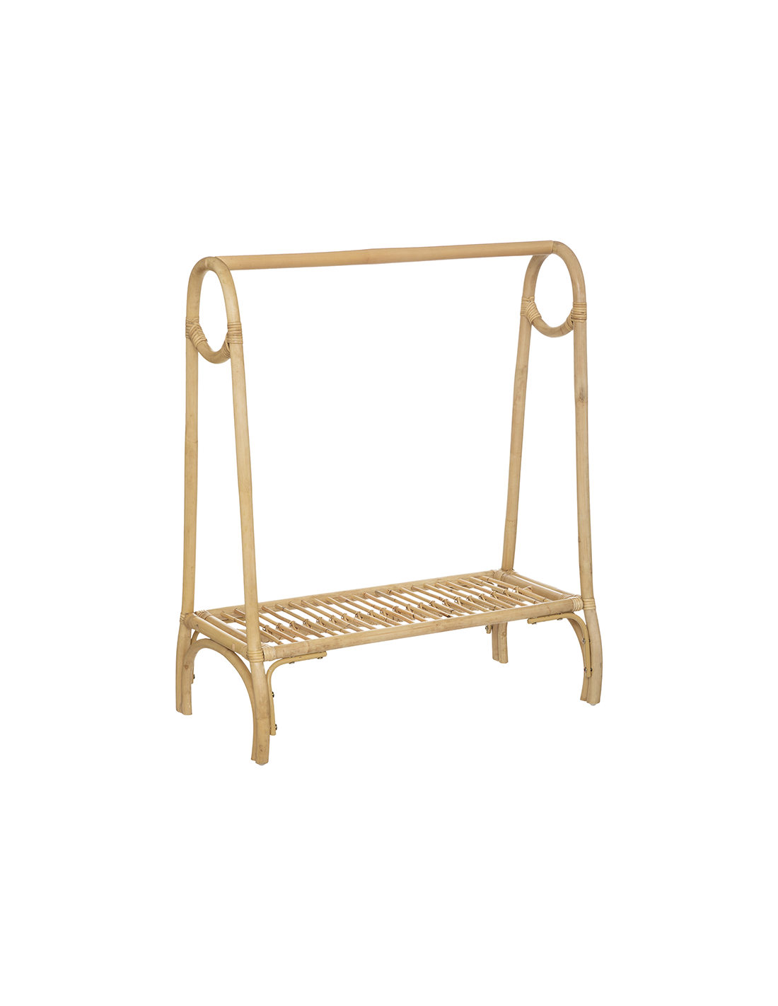 Ce portant à vêtements est entièrement réalisé en rotin et dispose d’une tringle ainsi que d’une surface de rangement très pratique au niveau de la base des 4 pieds. Vous pourrez y suspendre des vêtements et y ranger chaussures ou boîtes de rangement.