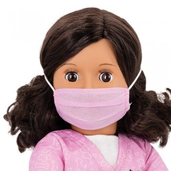Paloma est habillée d'une tenue médicale rose et blanche. Elle possède tous le matériel pour soigner les animaux : un stéthoscope, un thermomètre, une seringue, des friandises, une collerette.. La poupée porte même une petite culotte !