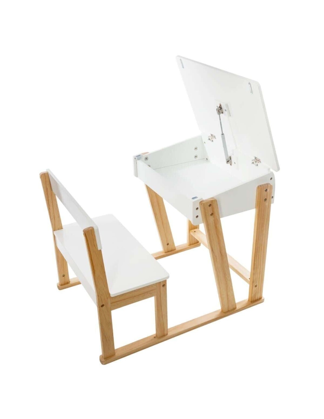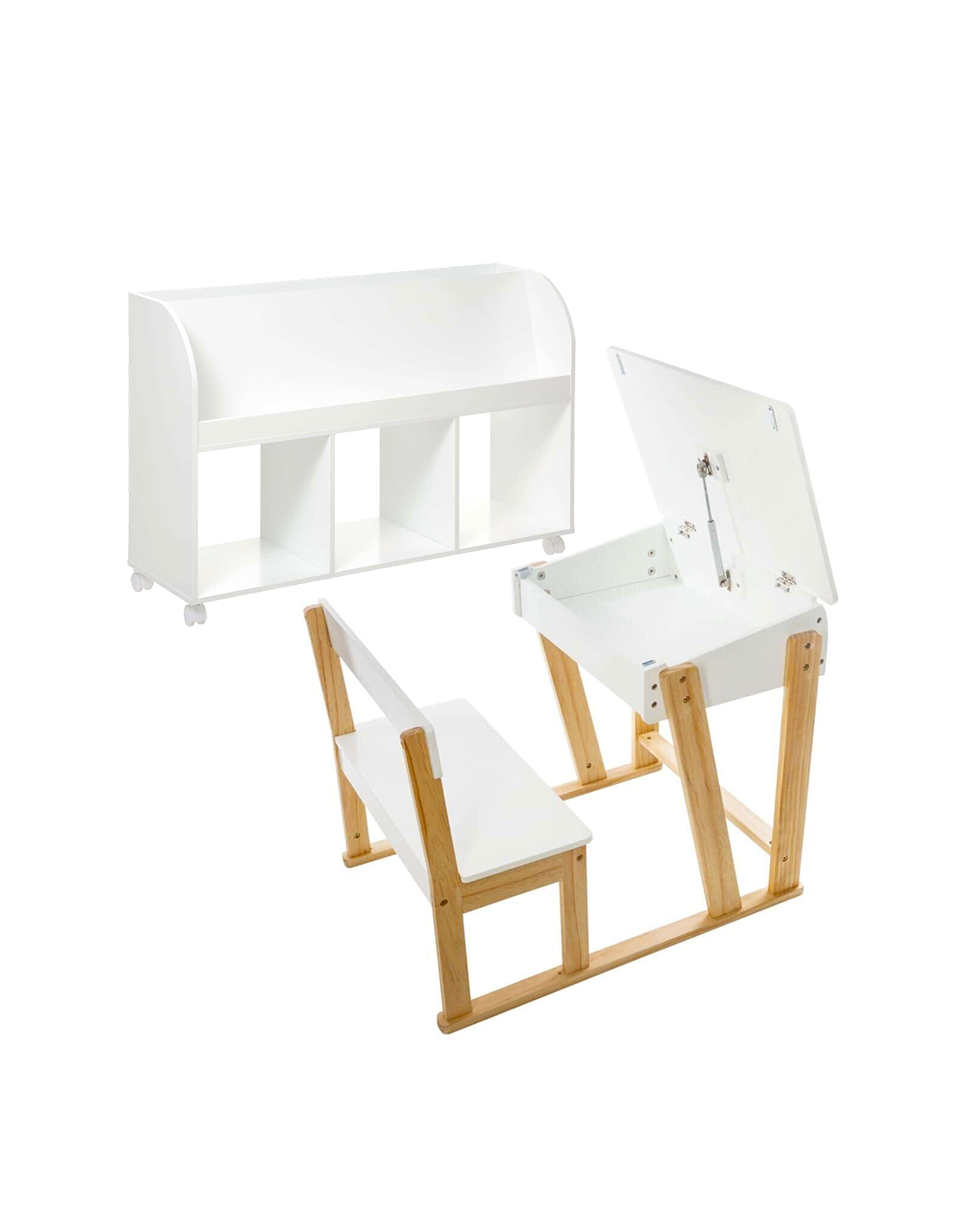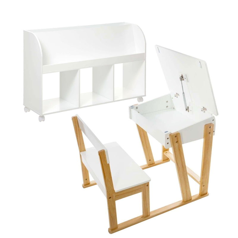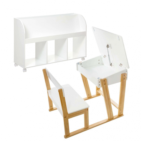 Cet ensemble contient un pupitre très utile pour votre enfant. Il peut travailler les devoirs ou tout simplement jouer. Vous avez aussi une bibliothèque avec 3 casier pour mieux ranger ses affaires.