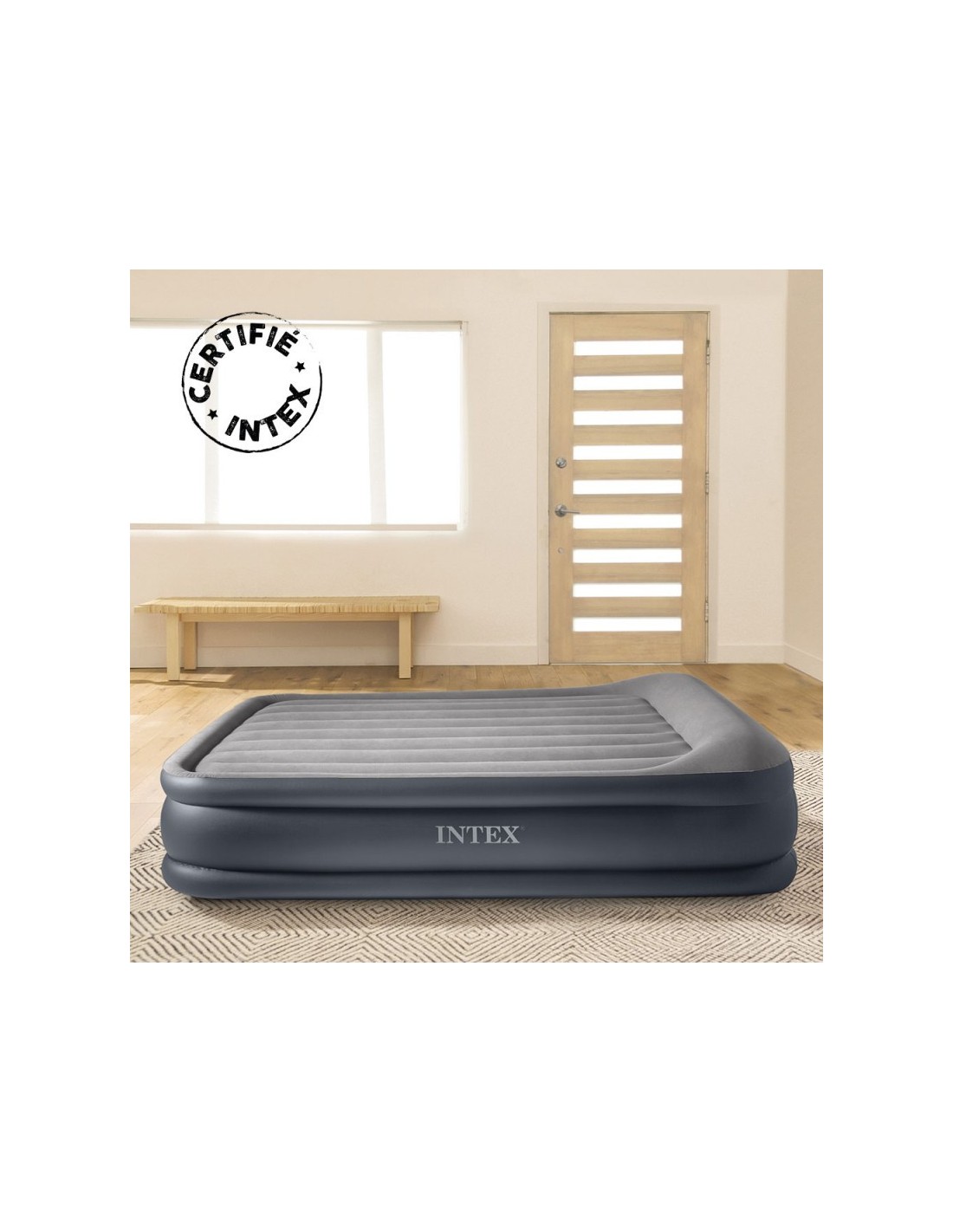 Grâce à son gonfleur électrique et sa valve grande ouverture, le gonflage et le dégonflage s'effectuent en moins de 4 minutes : on ne peut pas faire plus simple ! Sa hauteur de 42 cm vous offrira un couchage douillet proche d'un lit traditionnel. Ce matelas est à la fois pratique et confortable. Pratique car très peu volumineux une fois dégonflé, vous pourrez ainsi facilement le ranger et le transporter (il est de plus fourni avec un sac de transport) et confortable parce qu'il est doté de la technologie Fiber Tech INTEX.