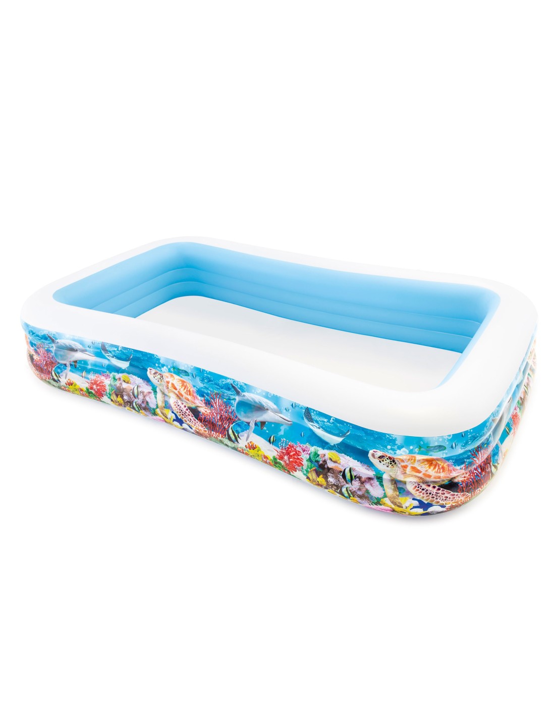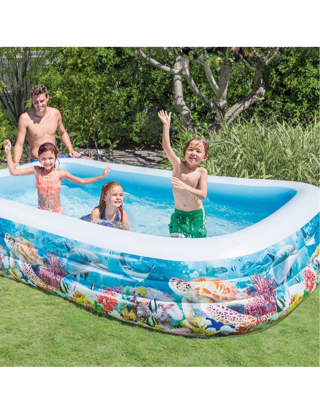 Cette piscine décorée de récifs coralliens permettra d'accueillir toute la famille de par ses larges dimensions. Elle dispose de 3 chambres à air avec soupape combinée pour un gonflage et un dégonflage rapide. Une bonde de vidange est aussi présente. Sa capacité est de 999 L et a une hauteur de remplissage de 37 cm. Rustine de réparation incluse. A partir de 6 ans.