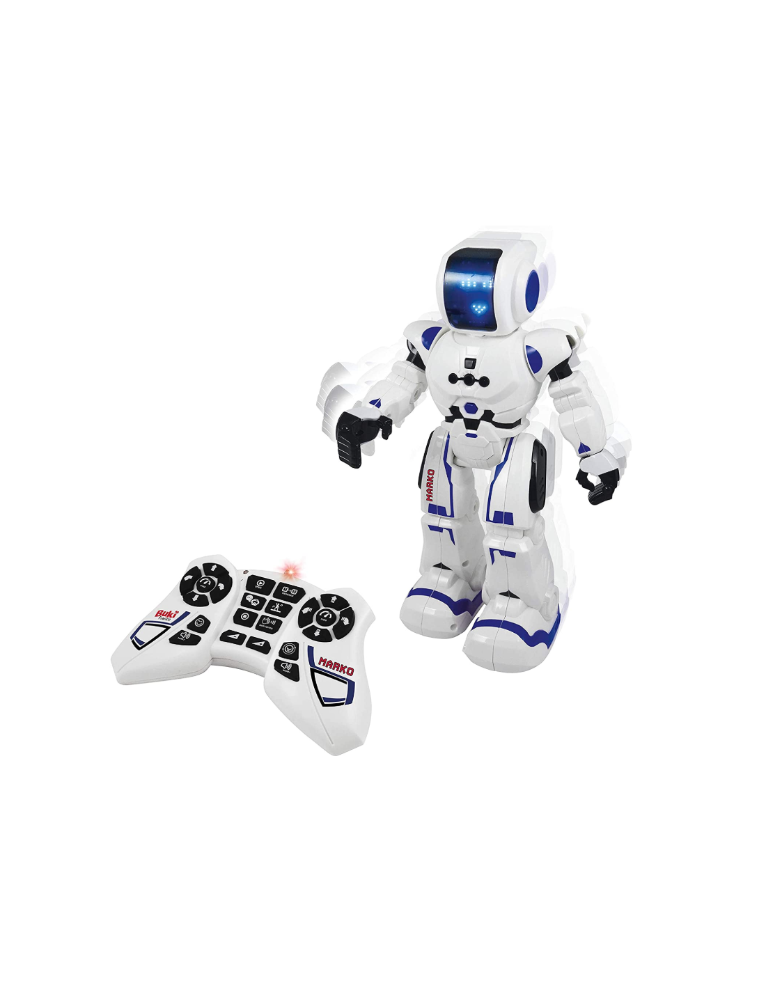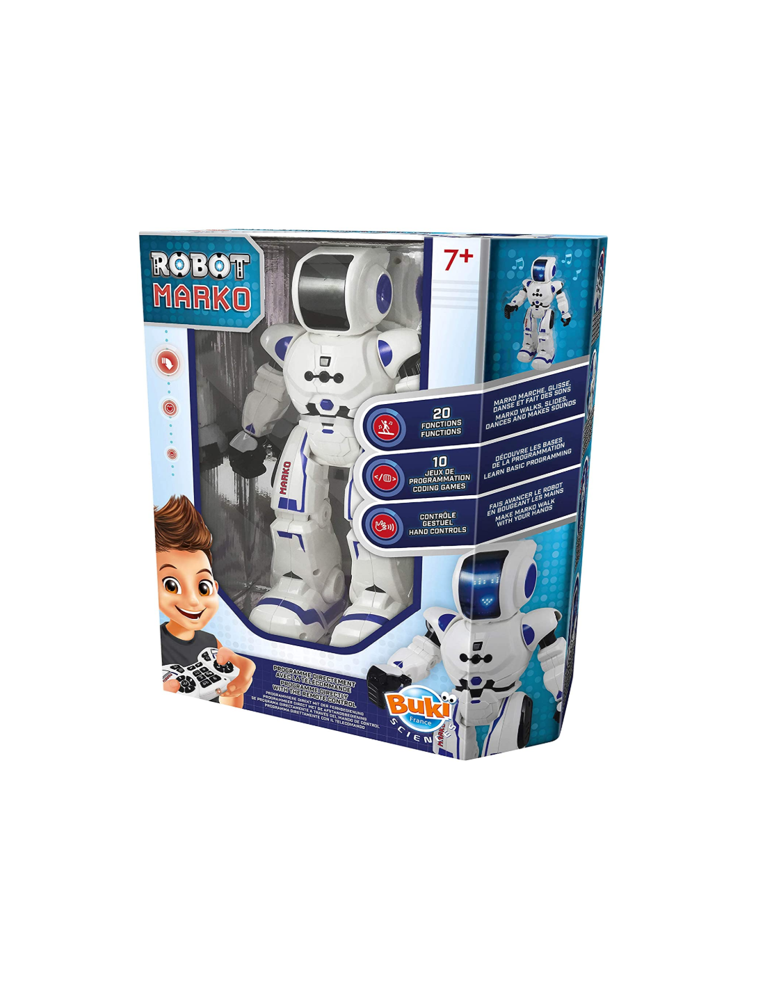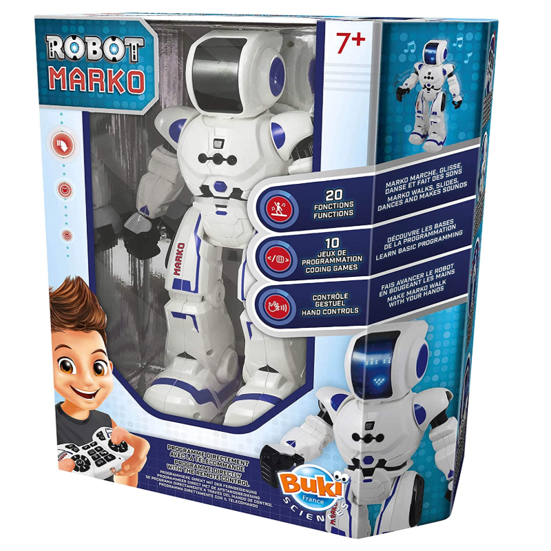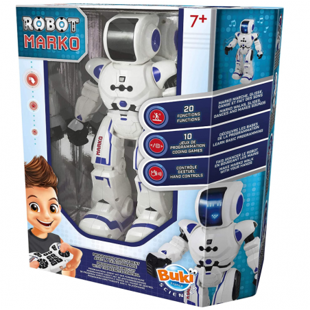 Marko est un robot avec plus de 20 fonctions différentes : marche, course, danse et émotions. Il se dirige avec une télécommande infrarouge fournie. Fonction reconnaissance des mouvements : le robot avance et recule grâce aux gestes de l'enfant. L'enfant peut programmer les actions du robot avec la télécommande. 15 activités guidées pas à pas sont incluses dans la notice.