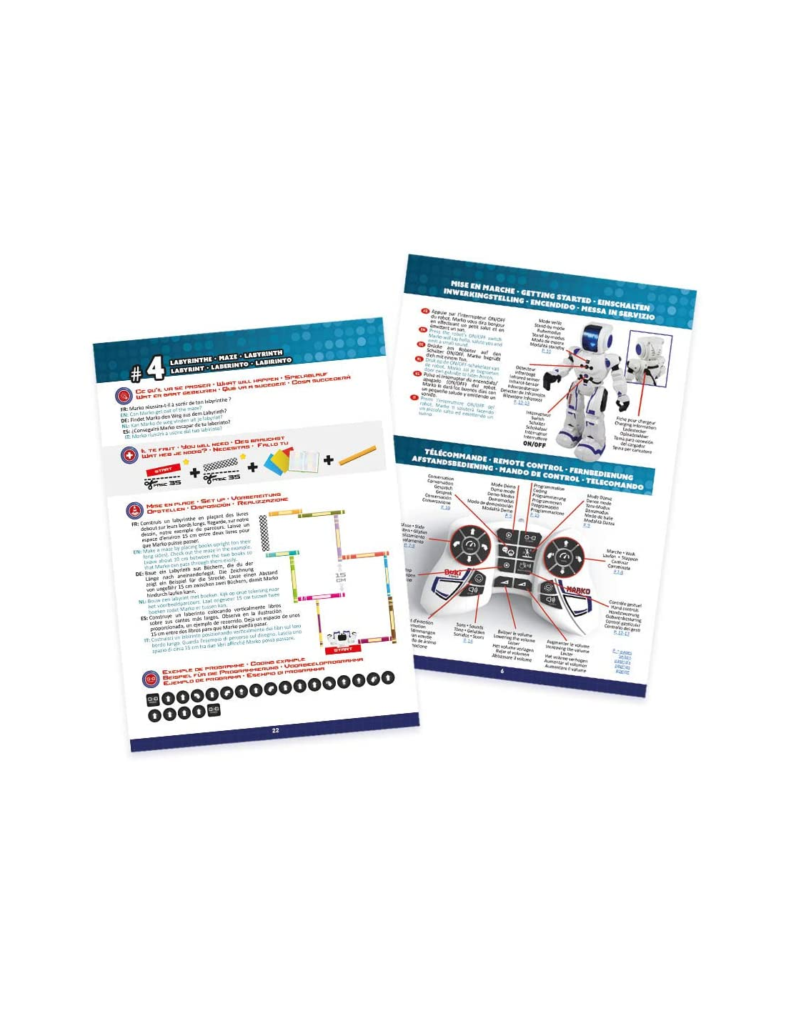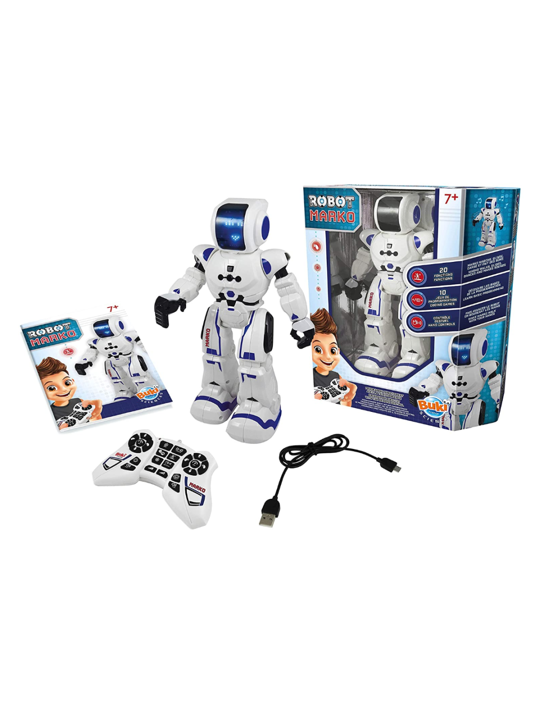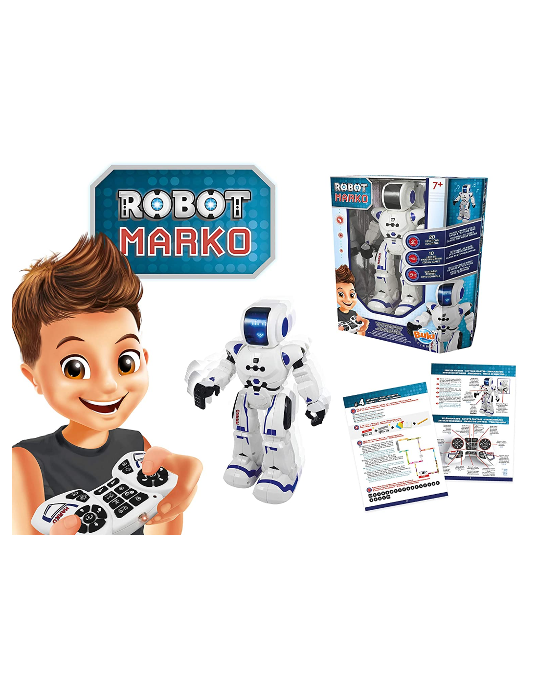 Marko est un robot avec plus de 20 fonctions différentes : marche, course, danse et émotions. Il se dirige avec une télécommande infrarouge fournie. Fonction reconnaissance des mouvements : le robot avance et recule grâce aux gestes de l'enfant. L'enfant peut programmer les actions du robot avec la télécommande. 15 activités guidées pas à pas sont incluses dans la notice.