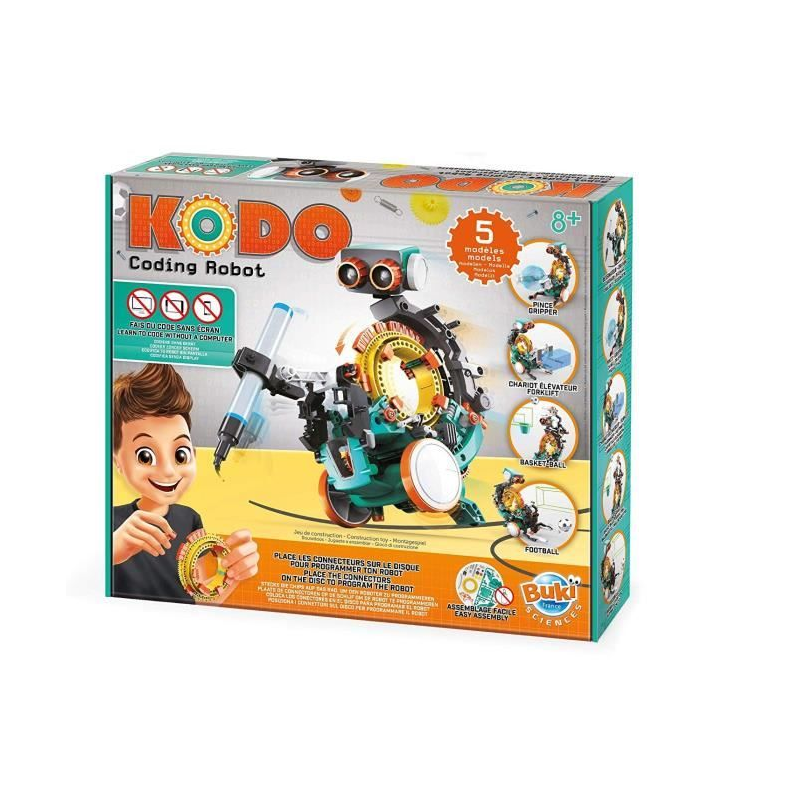 Ce jeu de construction te permettra d'assemble Kodo le robot codage et de découvrir ses 5 fonctions : dessin, chariot-élévateur, pince, basket-ball et joueur de football !
