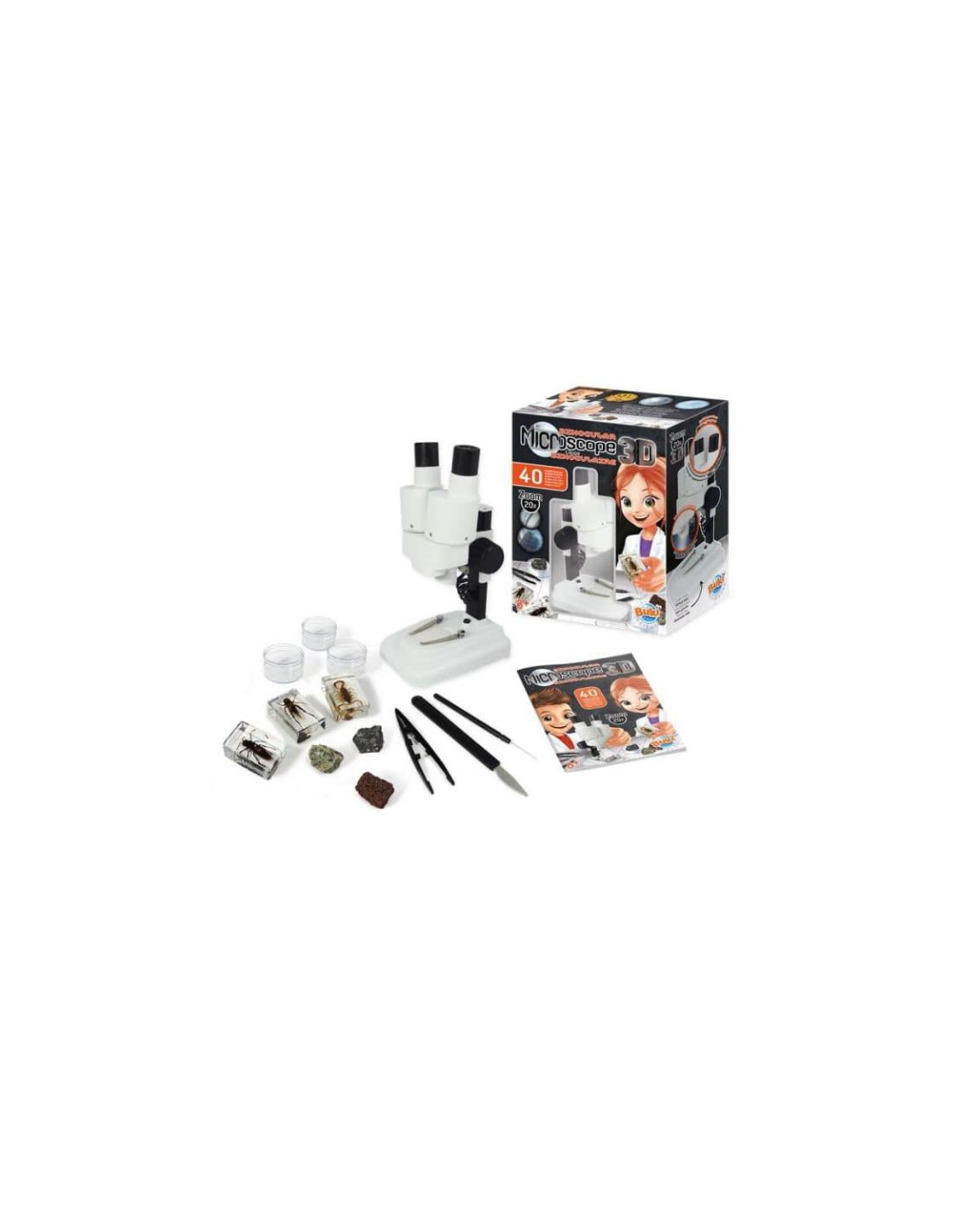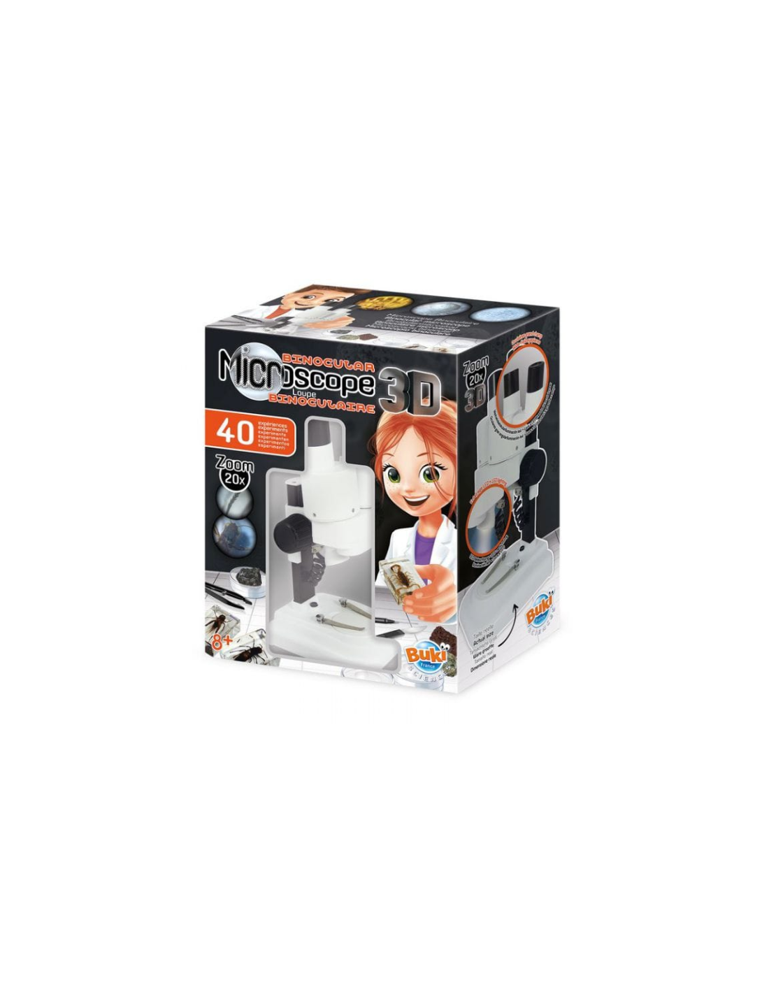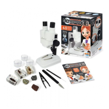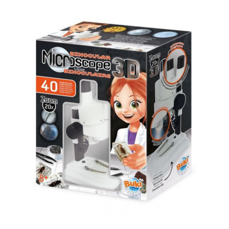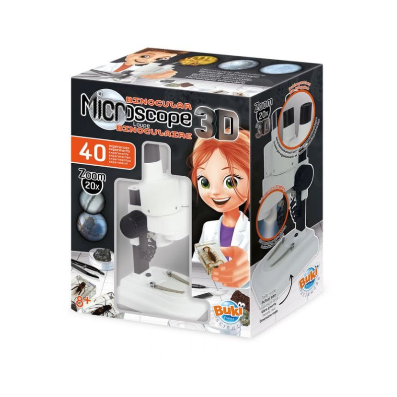 Découvrez le microscope stéréo 3D de Buki, un microscope stéréo avec oculaires et optiques en verre pour des observations d'objets en volume pour les enfants.