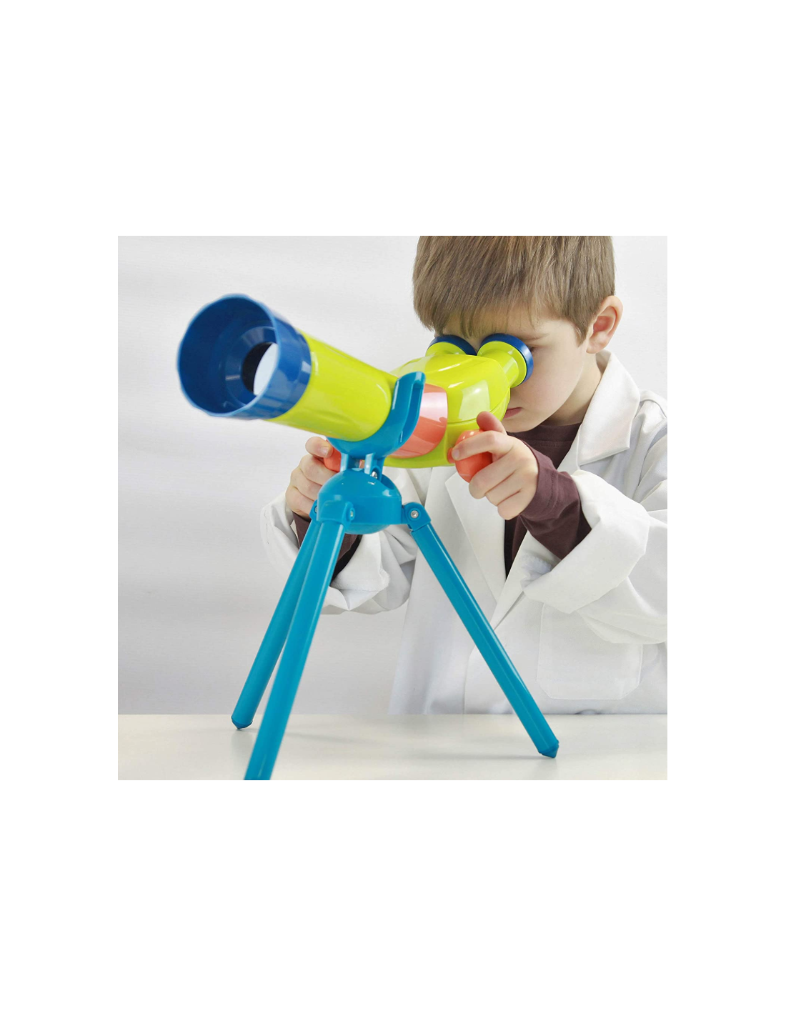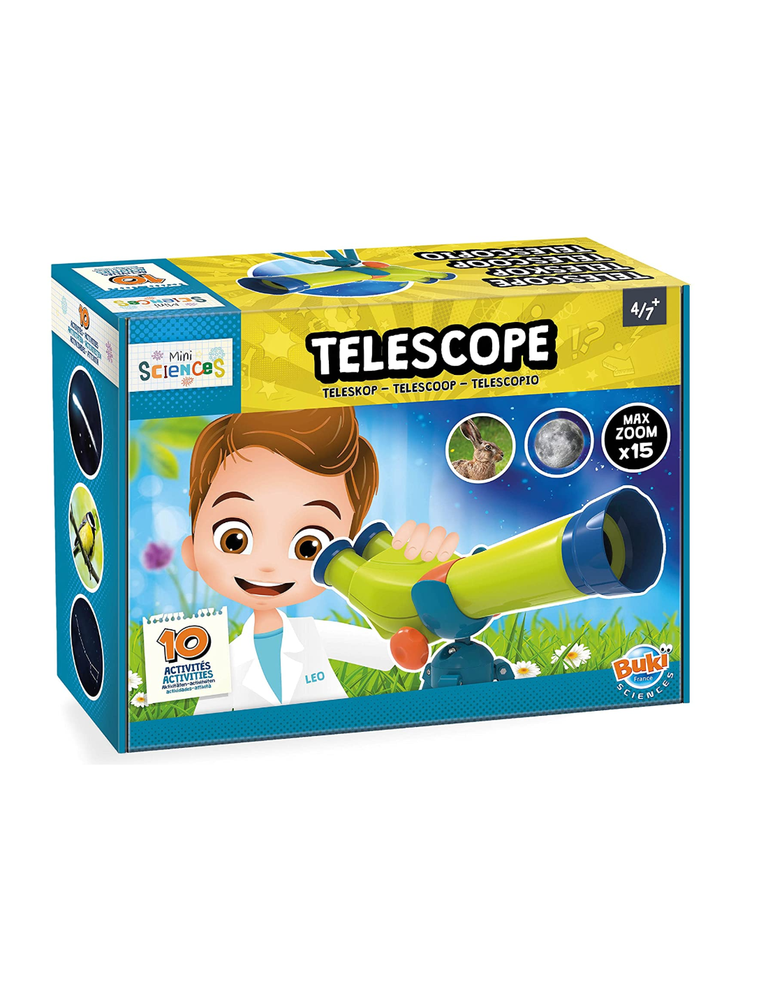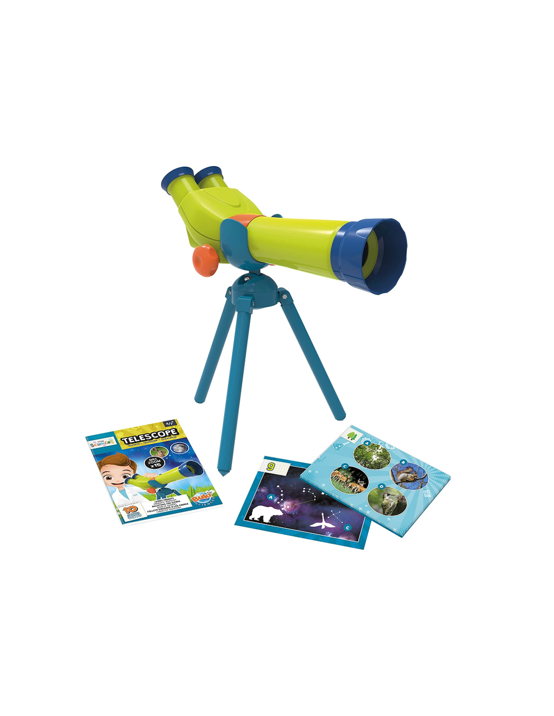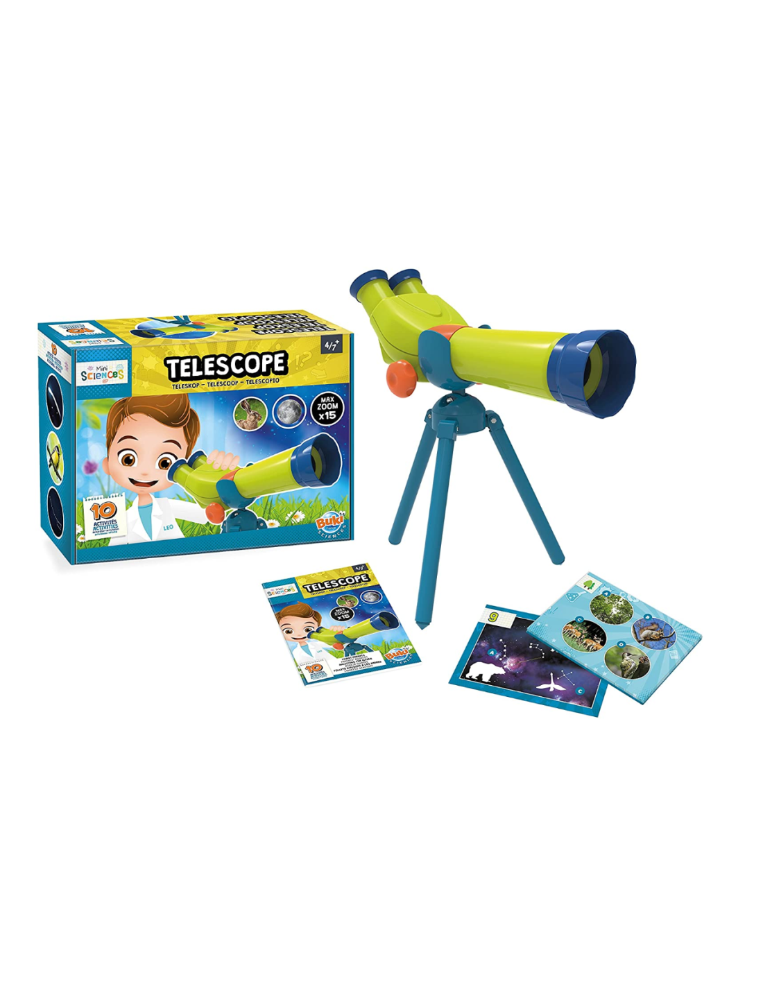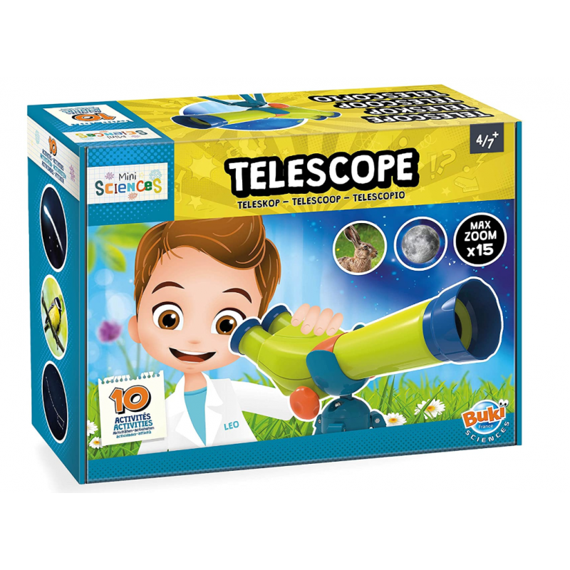 Contient des accessoires adaptés aux plus petits: un télescope binoculaire grossissement x15, diamètre 35mm et un trépied de 30 cm. Avec des 10 fiches entièrement illustrées pour les enfants et un livret à destination des parents.