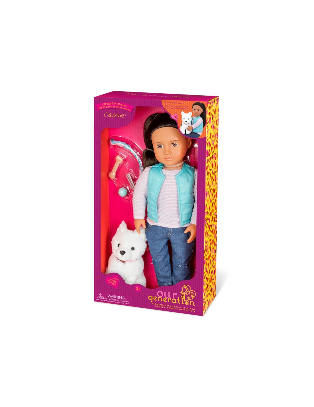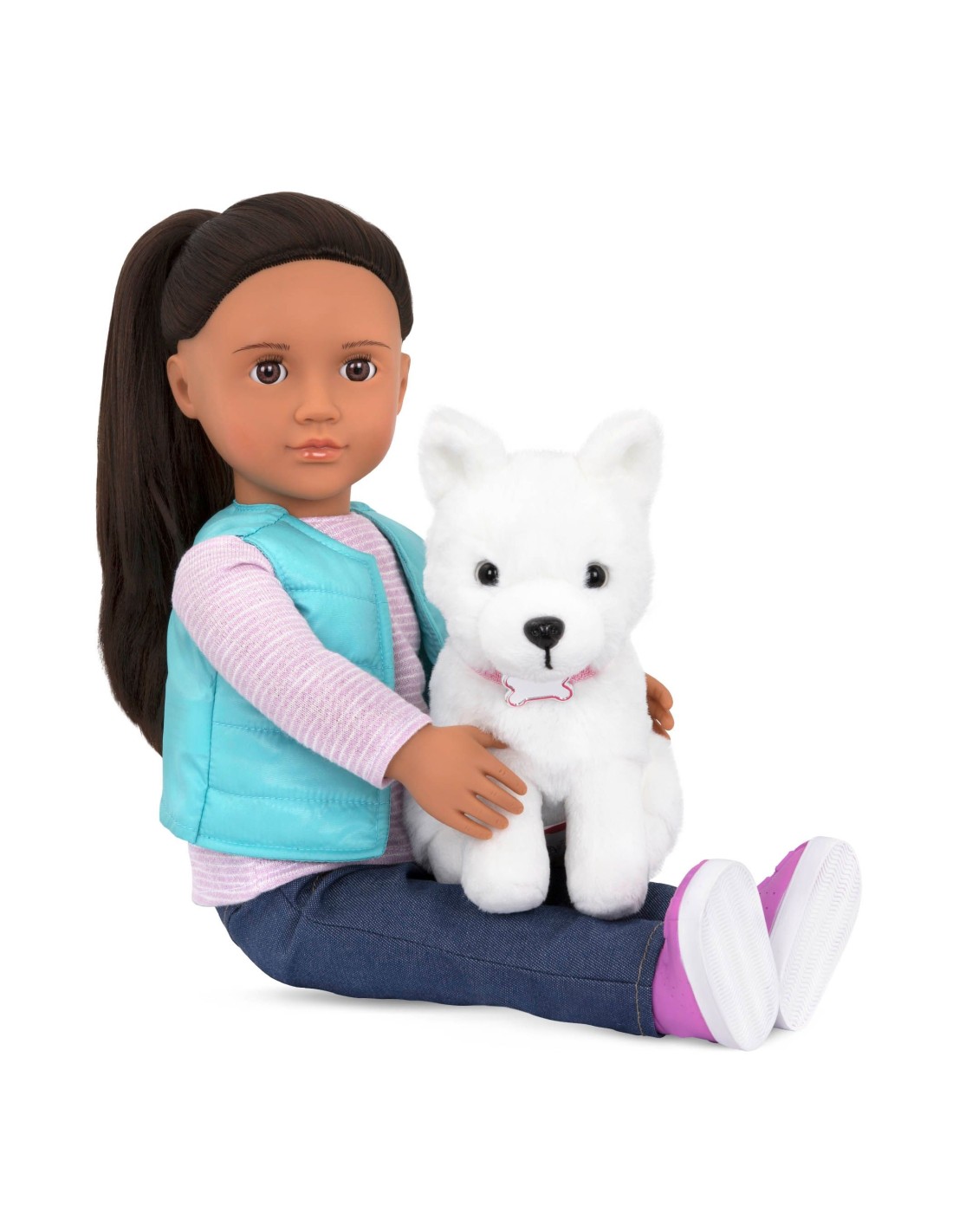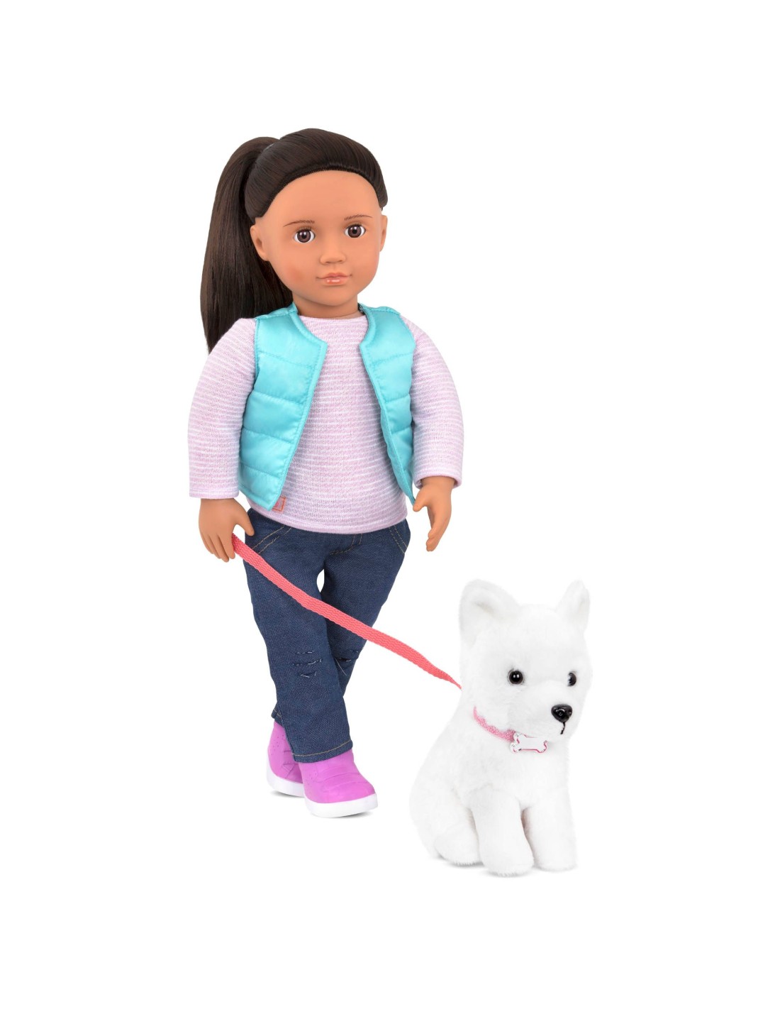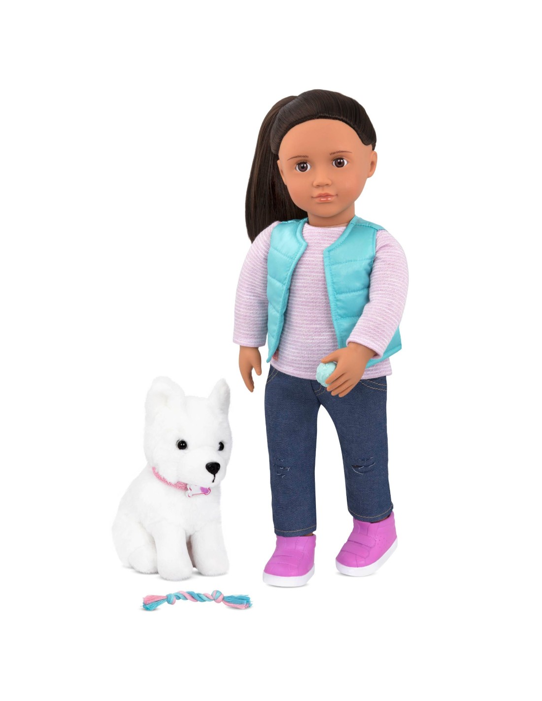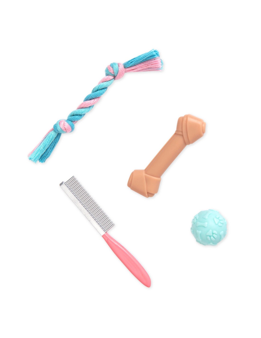 La poupée est accompagnée d'un chien et de différents accessoires.