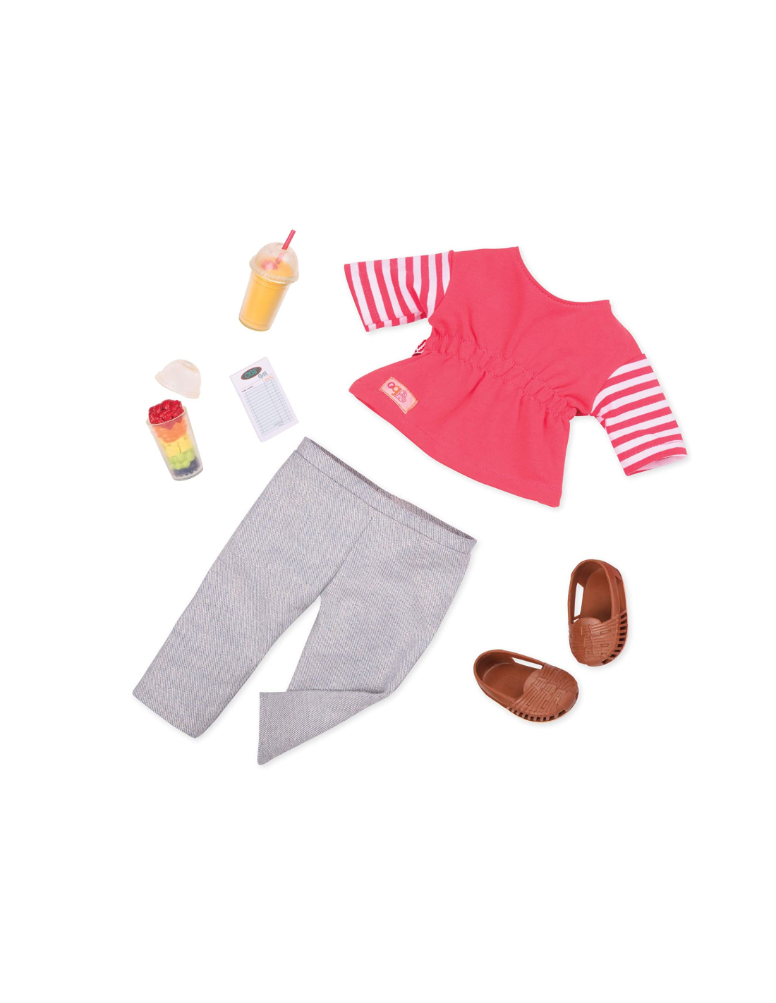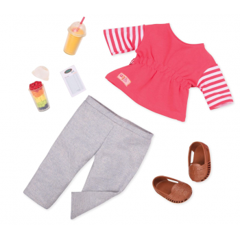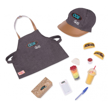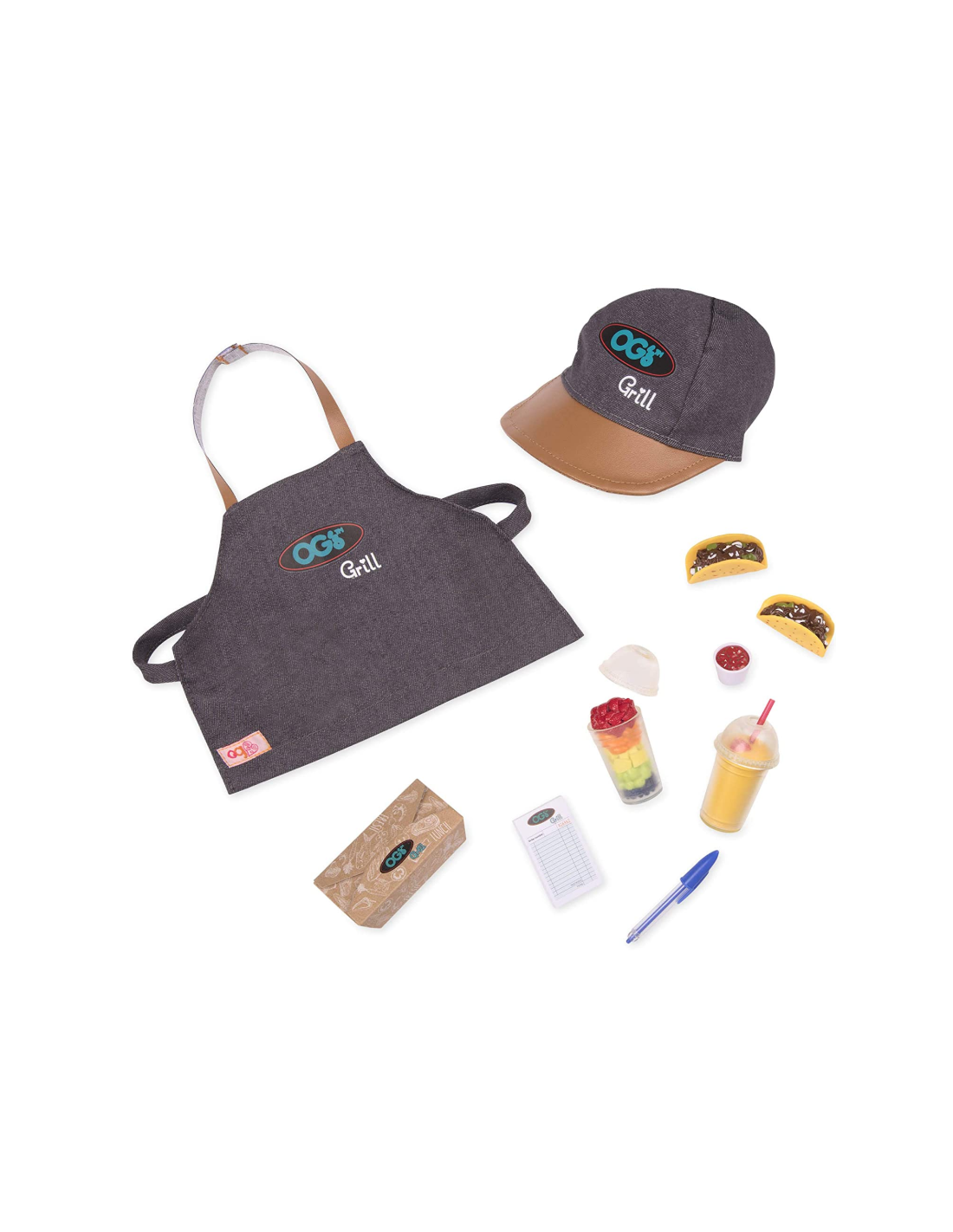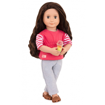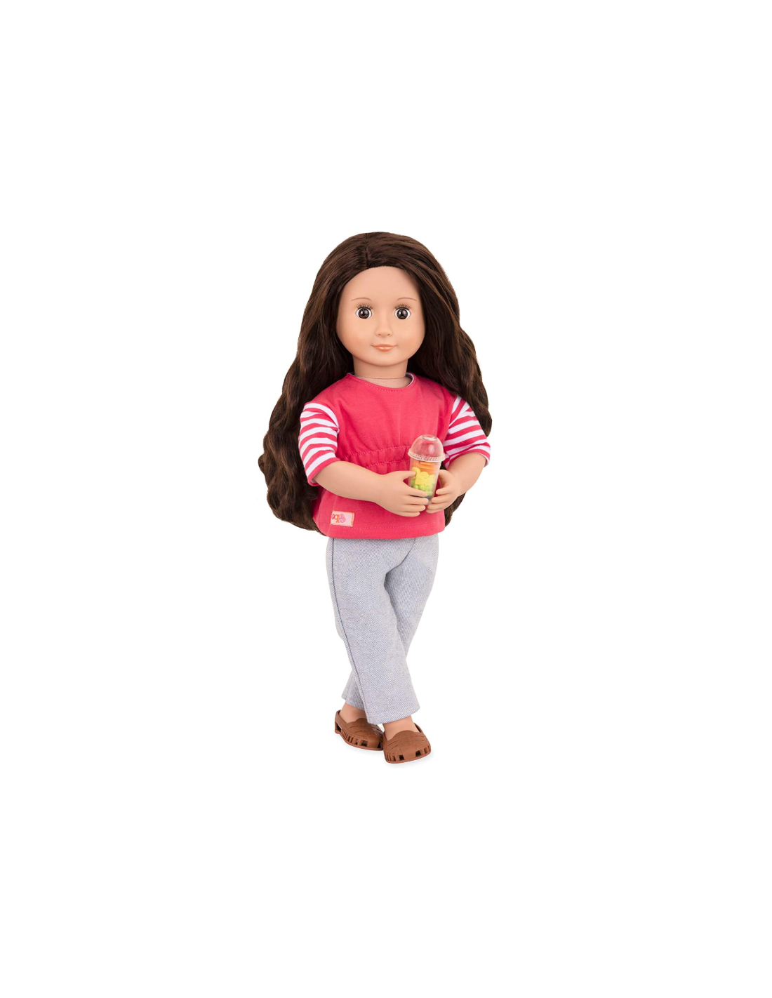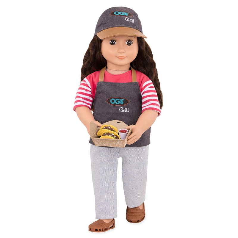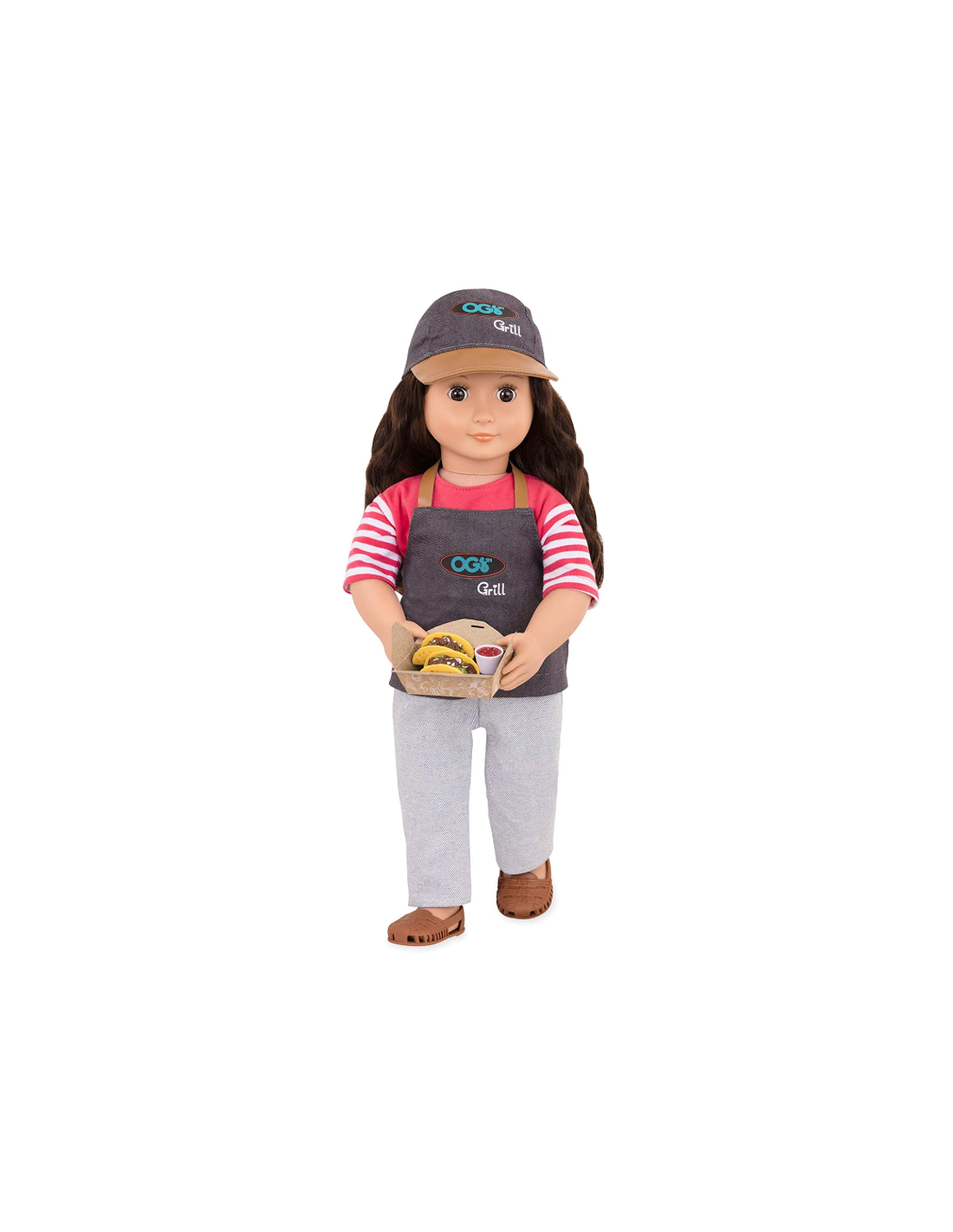 La poupée deluxe rayna de la marque Our Generation est une poupée de 46cm, aux cheveux bruns, aux yeux marron et à la peau claire. Elle porte un t-shirt rayé, un pantalon gris, des sous-vêtements et une paire de chaussures. Elle est fournie avec deux tacos aux boeufs avec sauce Salsa dans une boite à emporter, un stylo, un smoothies à la mangue, des fruits coupés, un bloc de commande, un tablier et une casquette.