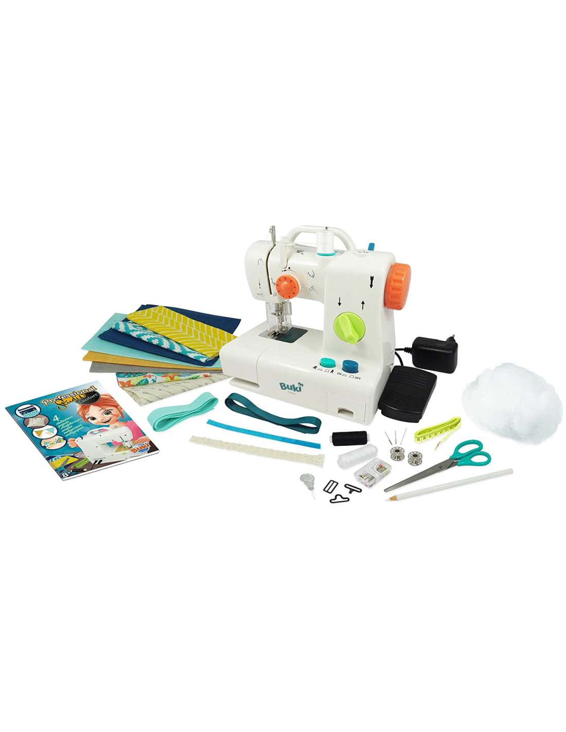Nouvelle version de la machine à coudre. Une machine à coudre idéale pour les débutants ! maniable, facile à utiliser grâce aux deux vitesses et au réglage de la tension numéroté ! apprends à coudre 4 projets tendances: guirlande de fanions, coussin à aiguilles, nœud papillon et vide-poche mural ! de nombreux accessoires dont des canettes en métal et des aiguilles de rechange pour la machine sont fournis.