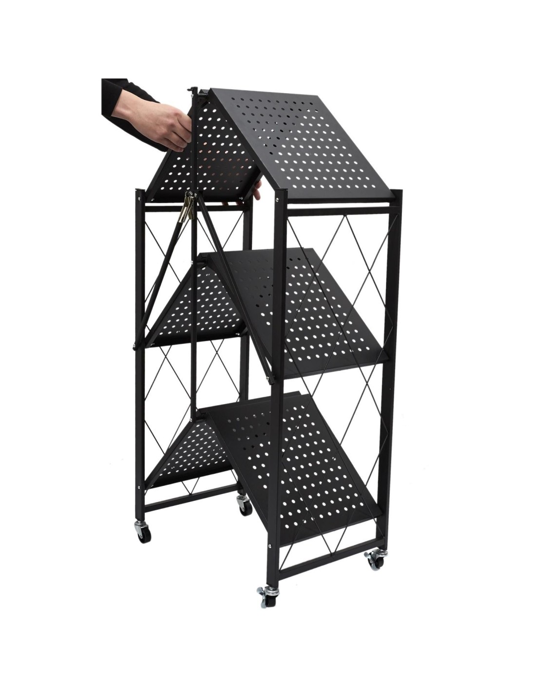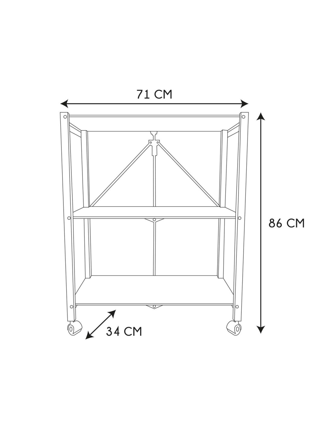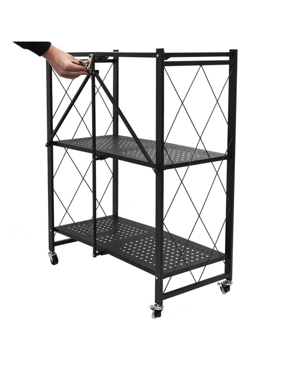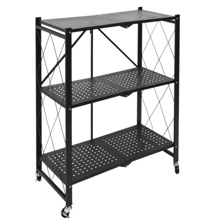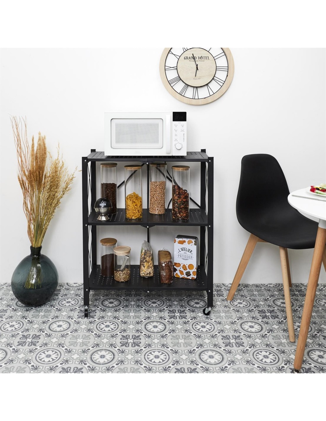 Une étagère pliante, cette étagère peut être utilisée non seulement dans la cuisine, mais aussi dans toute autre pièce où une grande quantité d'objets doit être stockée. Sa conception à trois niveaux comprend des étagères ouvertes qui peuvent accueillir des articles lourds comme des livres et des bouteilles de vin en carton. L'étagère est fabriquée en métal durable avec une finition noire mate qui s'harmonisera avec n'importe quel décor.