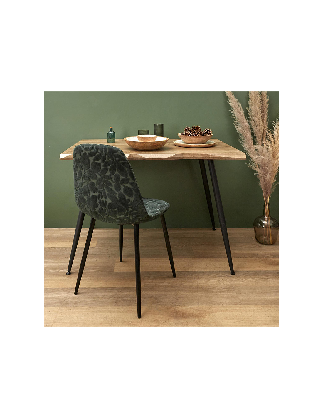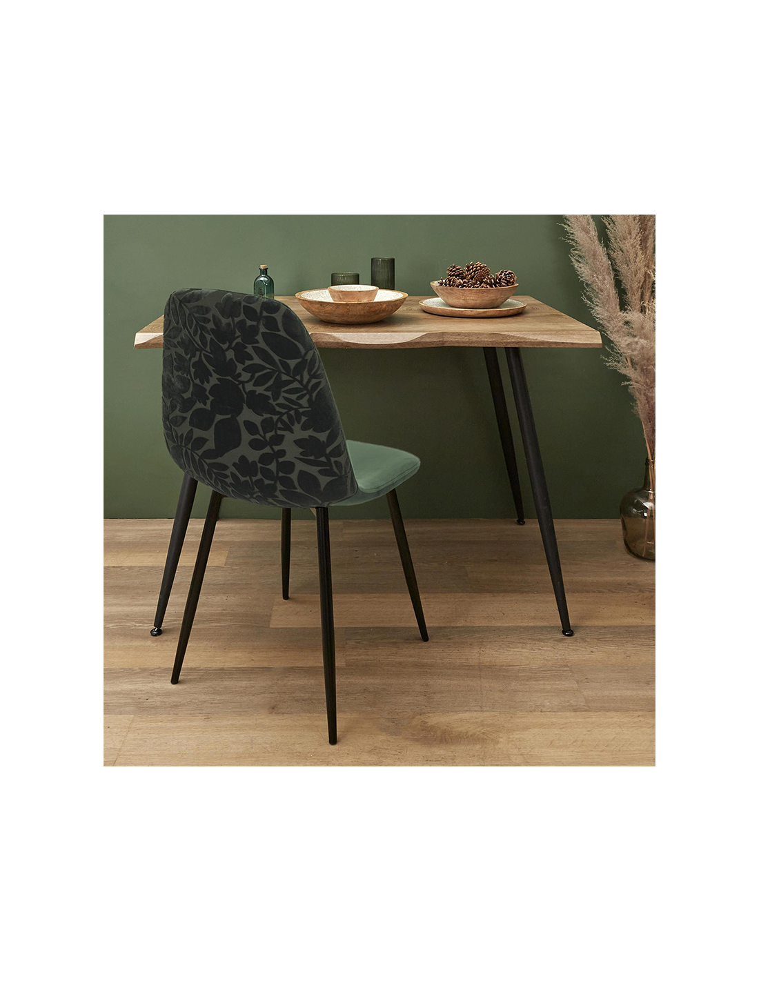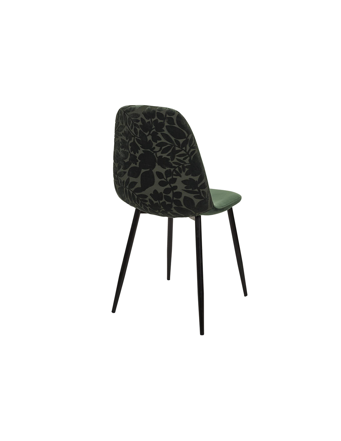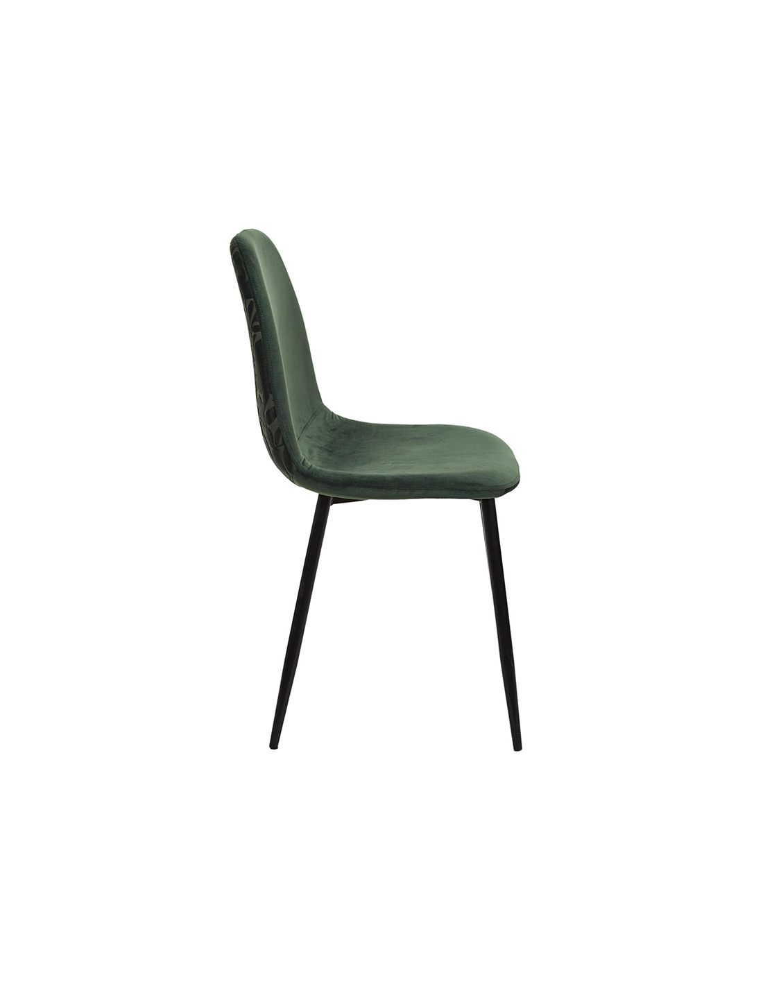 La chaise est faite d'un magnifique velours et de pieds en métal. Le luxueux velours à motifs ajoute une touche visuelle et un confort à la salle à manger. Cette chaise de salle à manger est une façon élégante d'ajouter une touche de style à votre salle à manger. L'étonnant motif de feuilles, le rembourrage en velours vert et les pieds en métal créent un accent moderne que vous pourrez utiliser pendant des années. Ce n'est pas seulement un meuble, c'est de l'art. Avec son luxueux tissu en velours à motifs et ses pieds en métal, cette chaise de salle à manger est sûre d'ajouter une touche de couleur sophistiquée à n'importe quel espace. Cette chaise est la combinaison parfaite de la forme et de la fonction. Les détails dorés lui confèrent un aspect élégant, tandis que la matière en velours rend l'assise confortable.