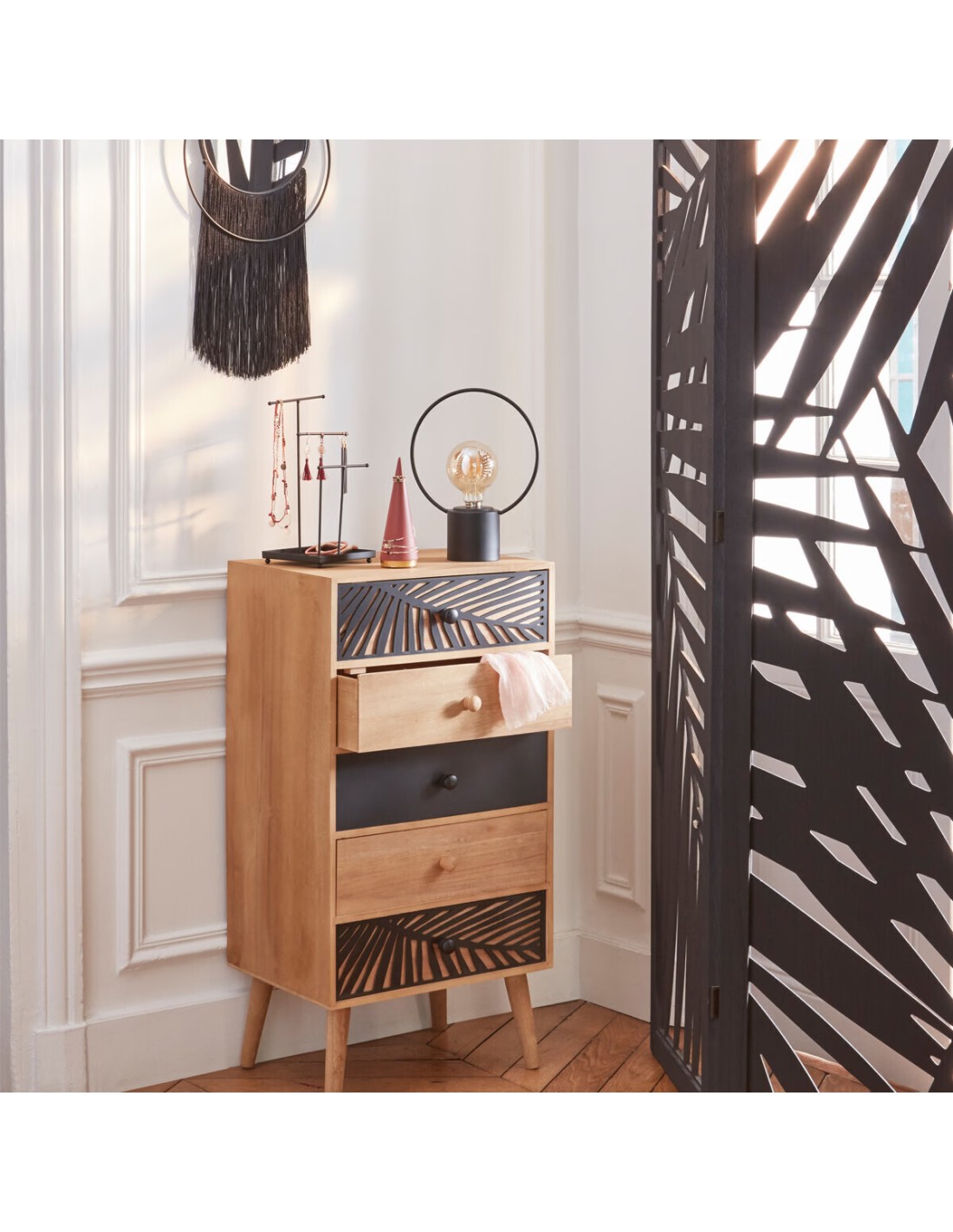 Apportez une élégance sophistiquée à votre intérieur avec le Paravent Feuille Akira Noir H170 de la marque Atmosphera. Ce paravent noir, riche en style et fonctionnalité, est un choix parfait pour ceux qui cherchent à ajouter un élément de design distinctif tout en conservant une utilité pratique. Le Paravent Feuille Akira est orné de motifs végétaux contemporains qui apportent une touche de nature et d'art à votre décor. Le design ajouré permet à la lumière de se diffuser délicatement à travers, créant une ambiance douce et accueillante tout en offrant la bonne dose d'intimité. Idéal pour diviser des espaces sans les fermer complètement, ce paravent à trois panneaux est parfait pour créer des zones distinctes dans de grands espaces ouverts, comme séparer le salon de la salle à manger, ou offrir une intimité dans un studio ou une chambre partagée. La couleur noire et le style raffiné du paravent le rendent facile à intégrer dans n'importe quel décor. Associez-le à des meubles en bois Atmosphera de tonalités similaires pour un look cohérent et stylé. Non seulement le Paravent Feuille Akira est fonctionnel, mais il sert également d'objet d'art décoratif. Utilisez-le comme fond pour votre espace de travail, décoration de coin lecture, ou simplement comme une pièce de déclaration dans votre entrée.