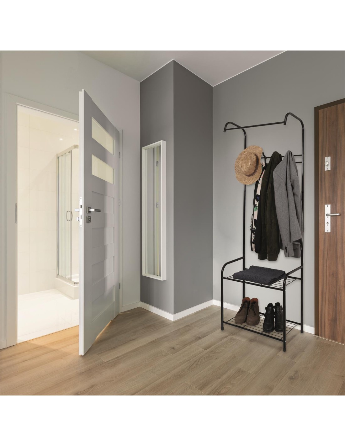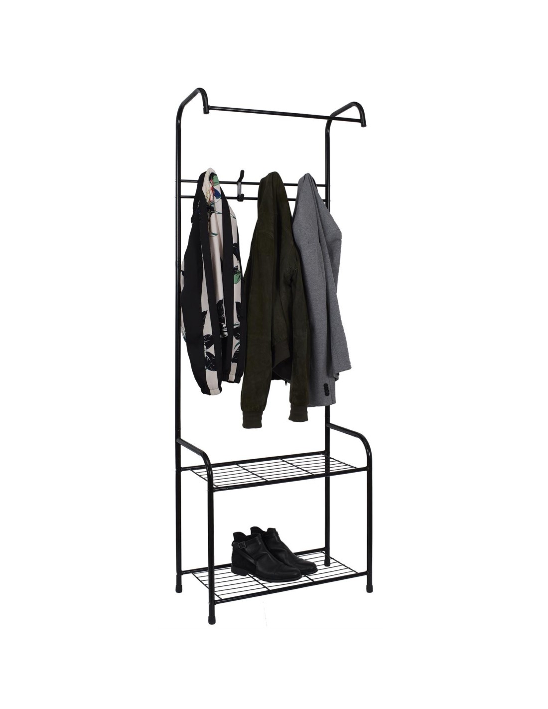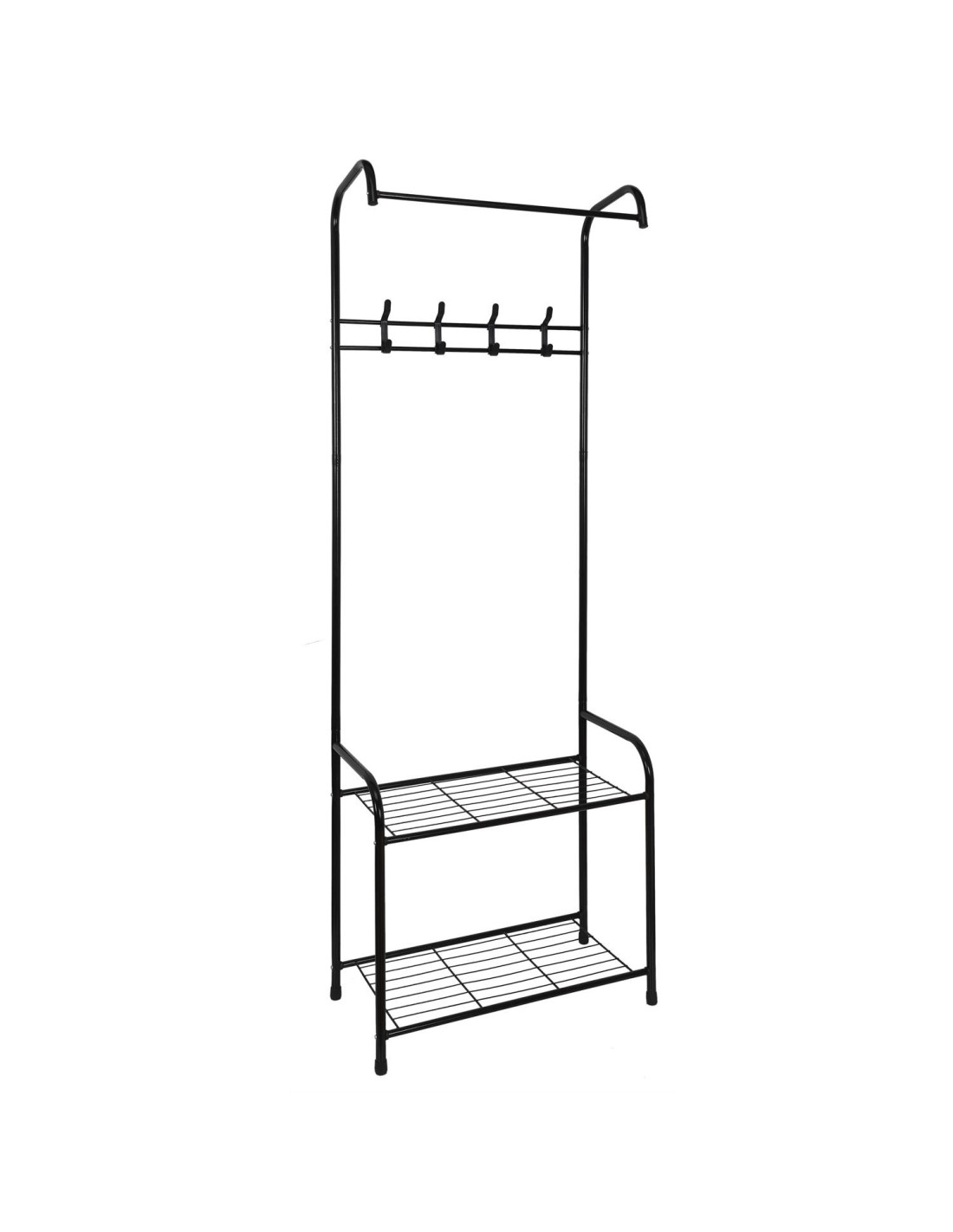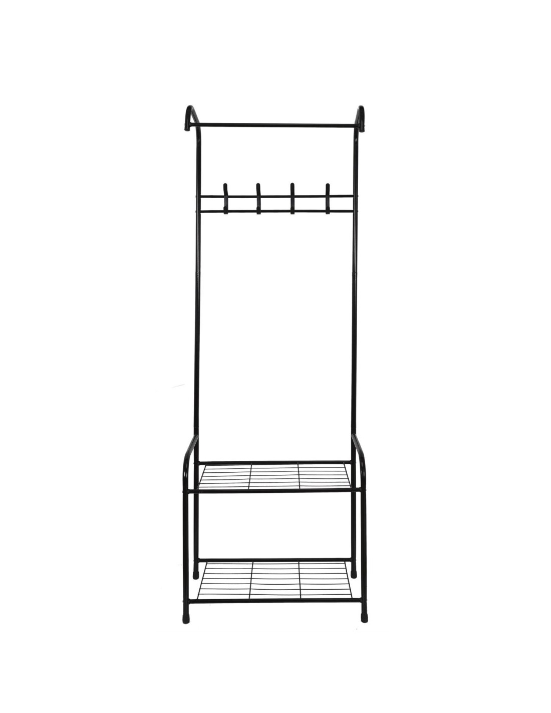 Cette penderie d'entrée ultra pratique présente 2 étagères pour vos chaussures et 4 crochets pour vos vestes et manteaux !