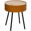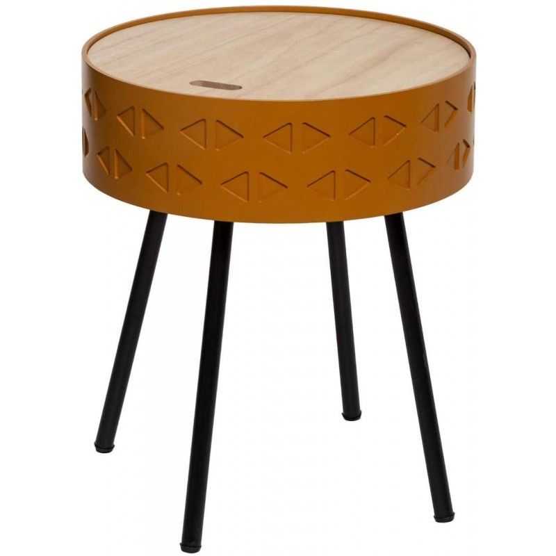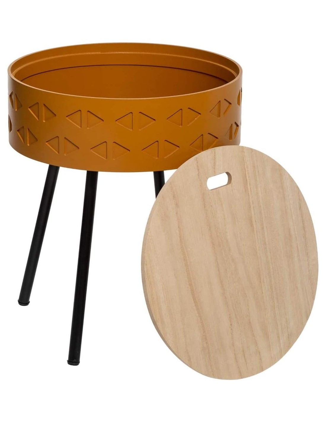 Cette table d'appoint moutarde est en bois MDF avec un plateau plaqué en bois de paulownia et 4 pieds en fer noir.