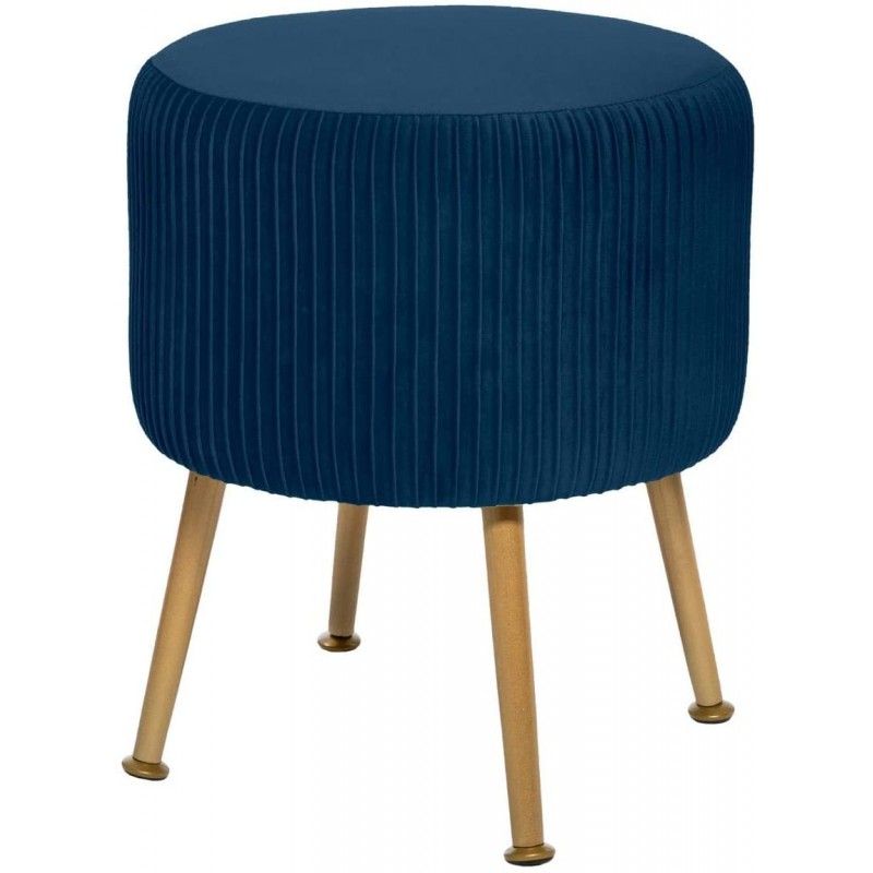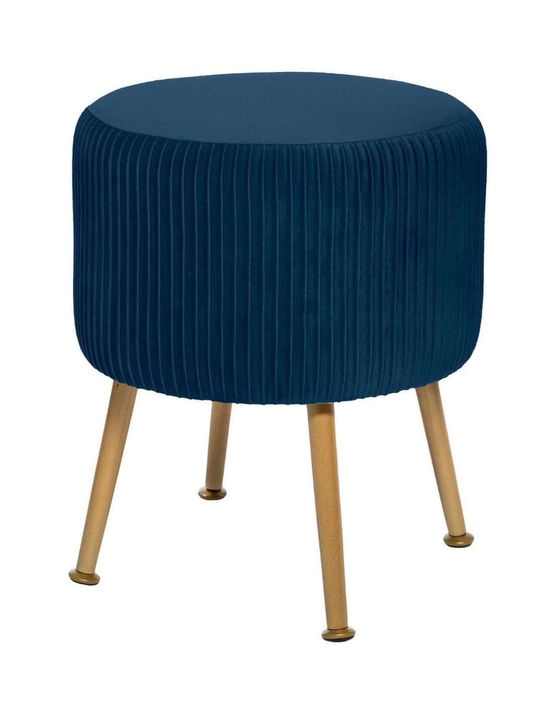 Ce tabouret bleu est en bois MDF avec un rembourrage en mousse polyuréthane, un revêtement en polyester et des pieds en fer.