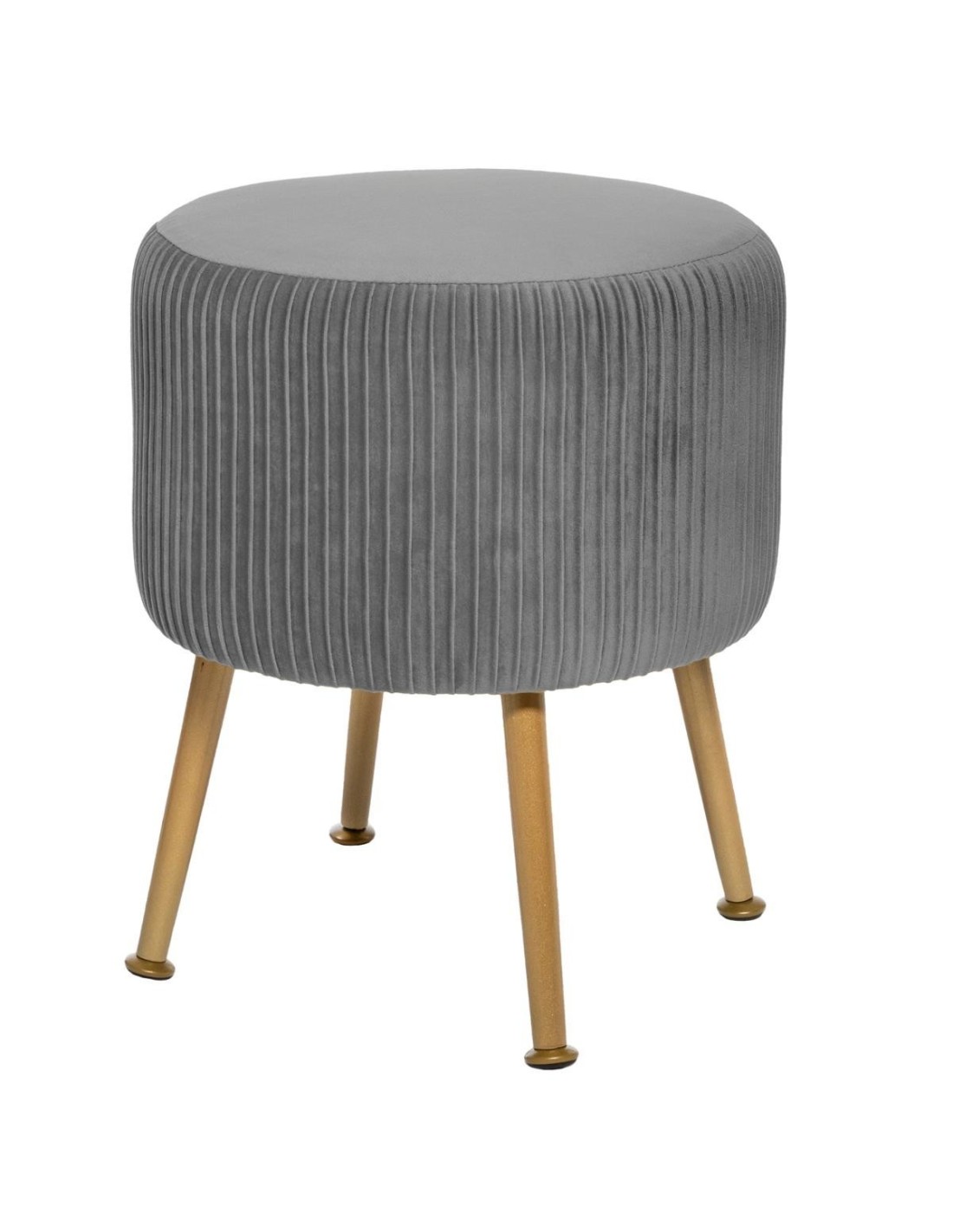 Ce tabouret gris est en bois MDF avec un rembourrage en mousse polyuréthane, un revêtement en polyester et des pieds en fer.