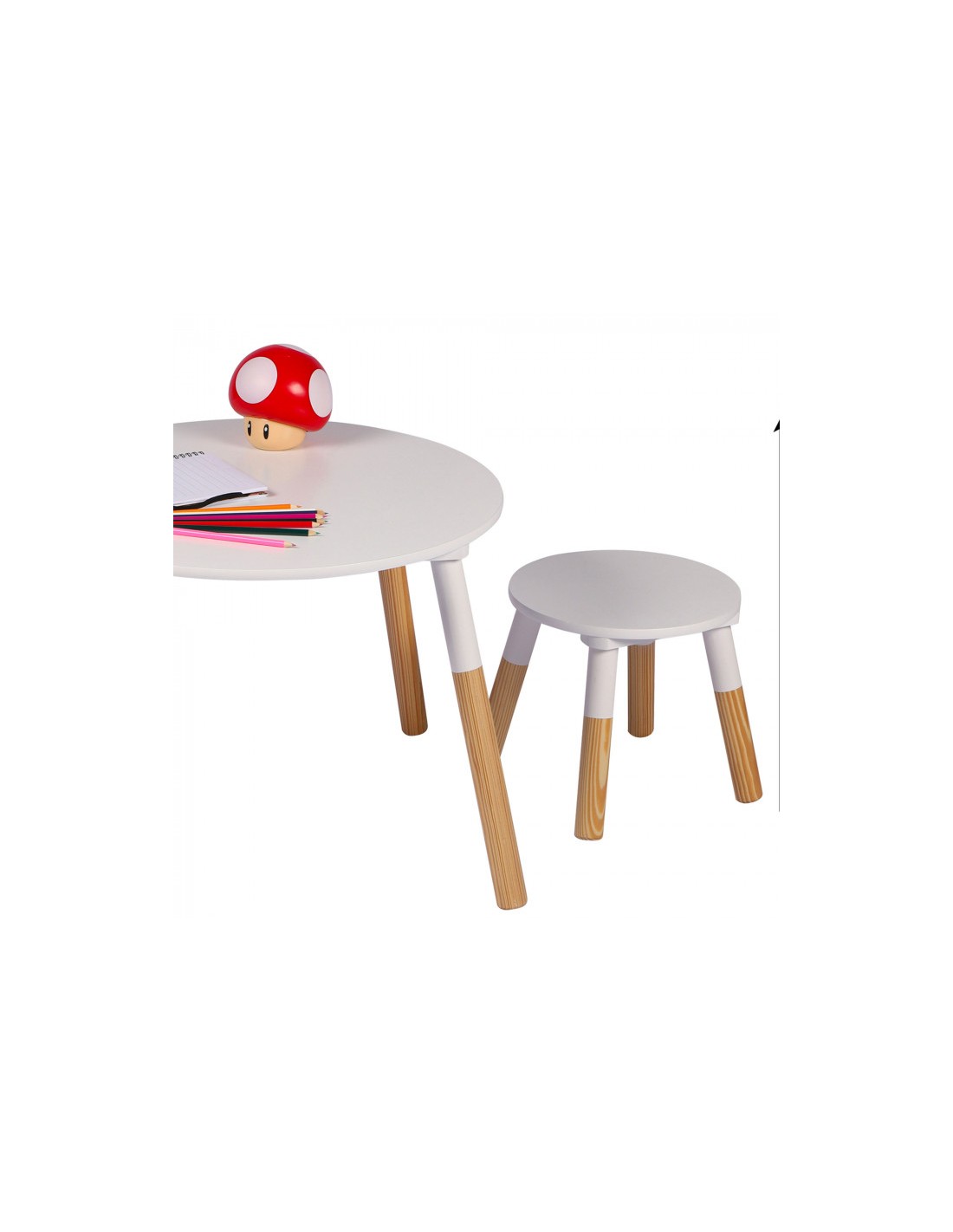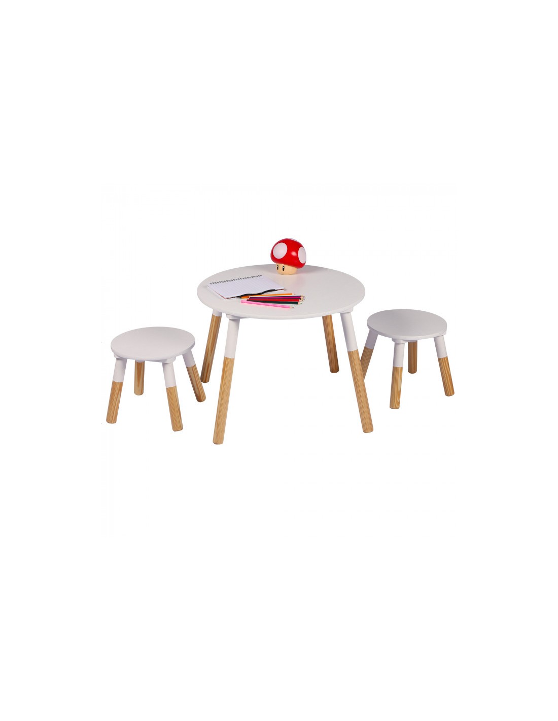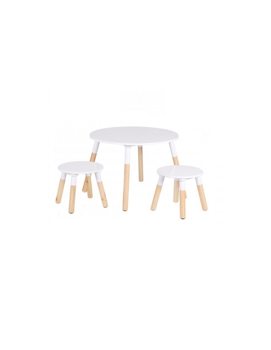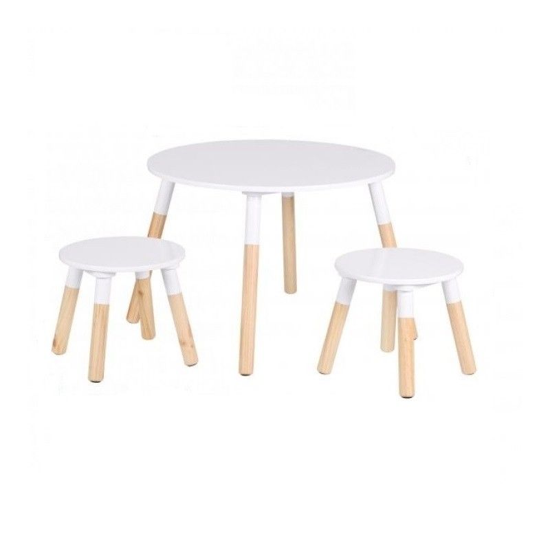 Table blanche pour enfants est ronde avec pieds en bois et deux tabourets de jeux.
